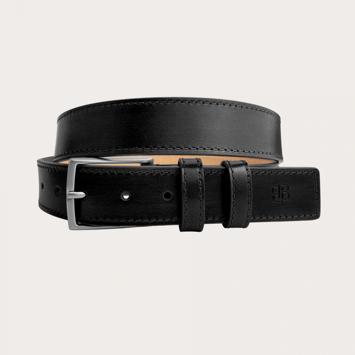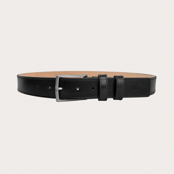 Elegante cinturón negro de piel tamponada a mano, con hebilla sin níquel. Un cinturón particular y único, capaz de sorprenderte.