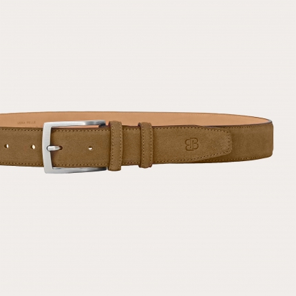Cinturón en un elegante color barro: este modelo en cuero de ante de alta calidad es un accesorio refinado y versátil. El cinturón está adornado con una hebilla de latón macizo, sin níquel, y un forro de nobuk primera flor.