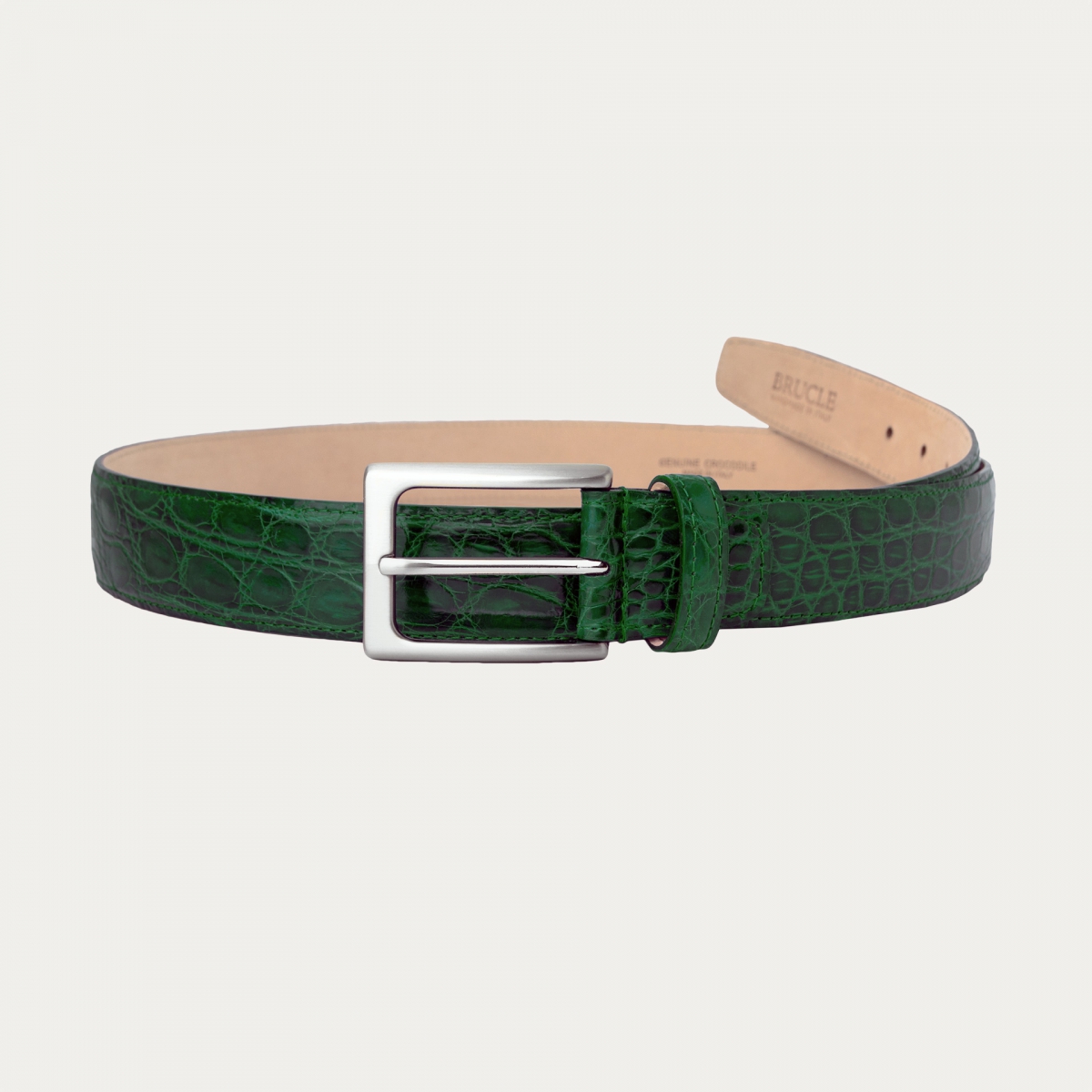 Cinturón de cocodrilo verde confeccionado con el flanco, una de las partes más preciadas, y acabado con costuras al tono y una hebilla cuadrada de latón macizo.