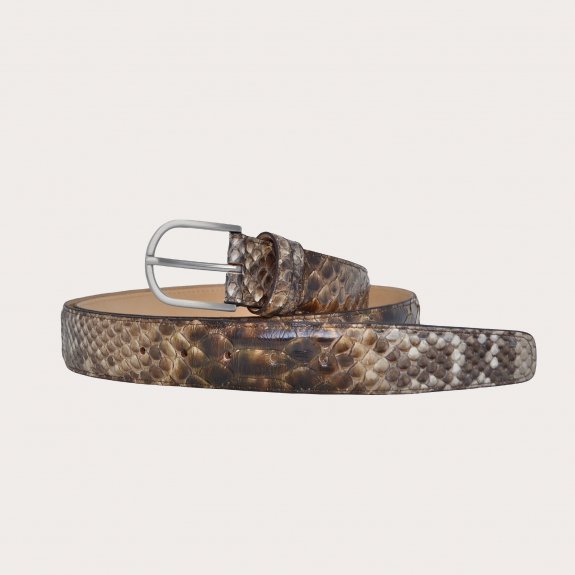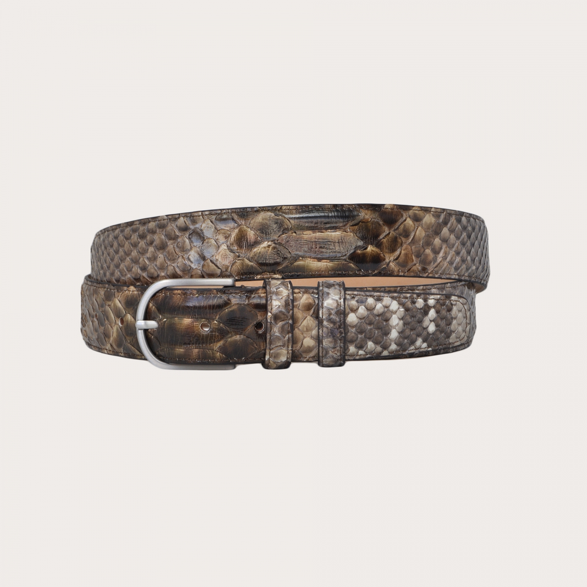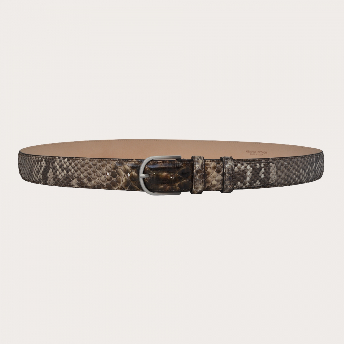 Cinturón refinado hecho a mano en pitón genuino en un color barro brillante adornado con acolchado a mano. Confeccionado con las mejores pieles exóticas y acabados de lujo. 100% Hecho en Italia.