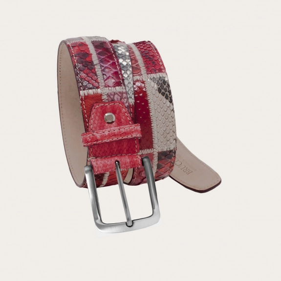 Cinturón en pitón real, realizado con patchwork en rectángulos en tonos rojos. Colorido y versátil, tiene todo el encanto de las pieles exóticas.