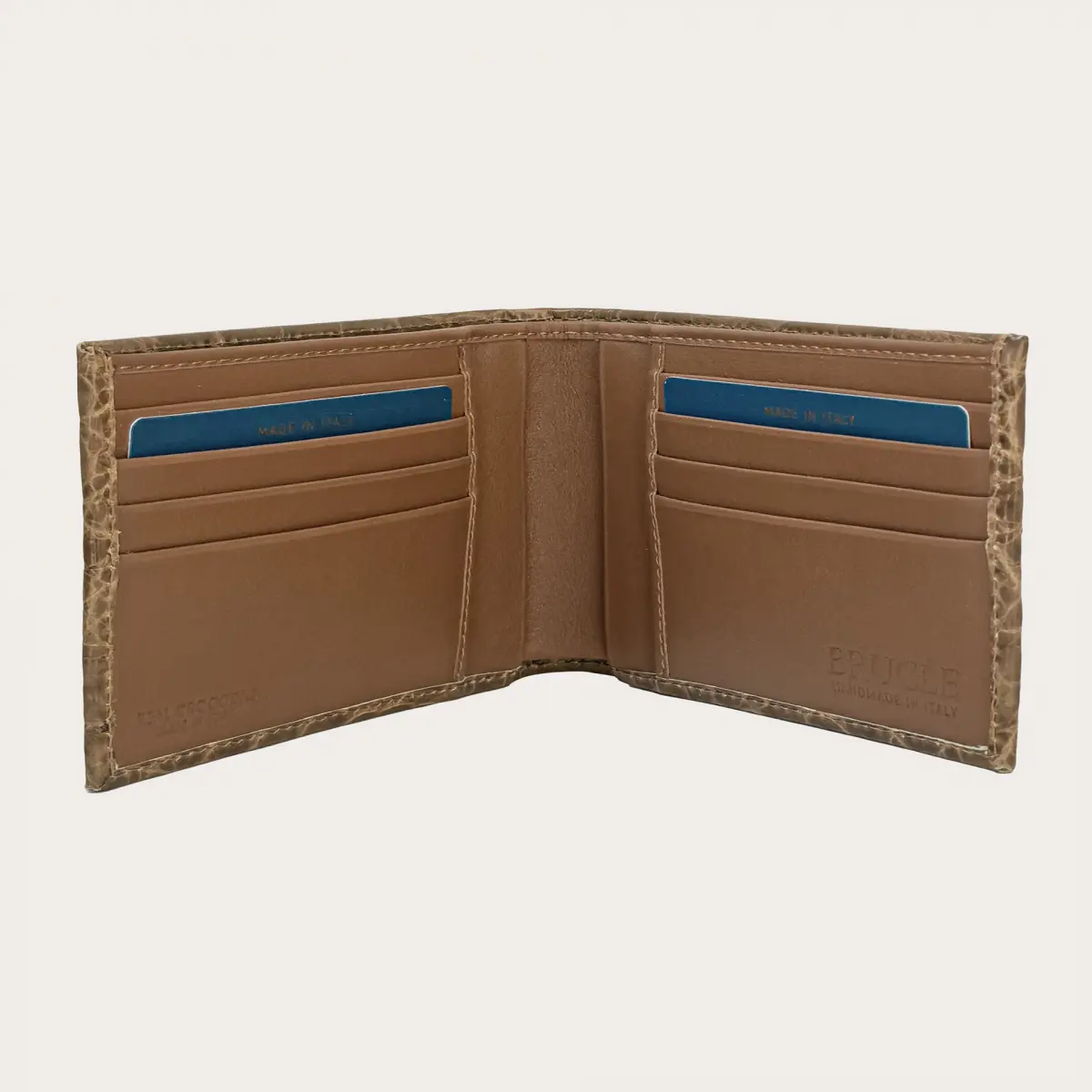Cartera de hombre en cocodrilo de un sorprendente color arena que realza la belleza y unicidad del auténtico cuero de cocodrilo. Hecha a mano en Italia, esta cartera está fabricada con cueros exóticos de alta calidad, garantizando durabilidad e inalterabilidad con el tiempo. Personalizable gratuitamente con grabados en el exterior o interior, es una idea de regalo especial. Descubre todos los accesorios a juego de la línea de lujo Brucle: cinturones, sujetabilletes, llaveros.