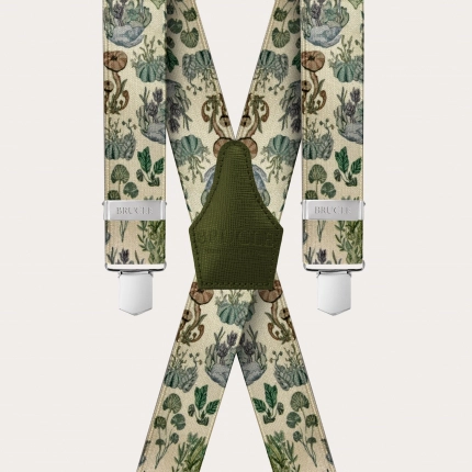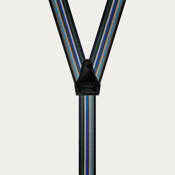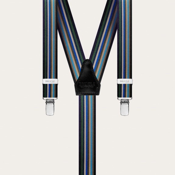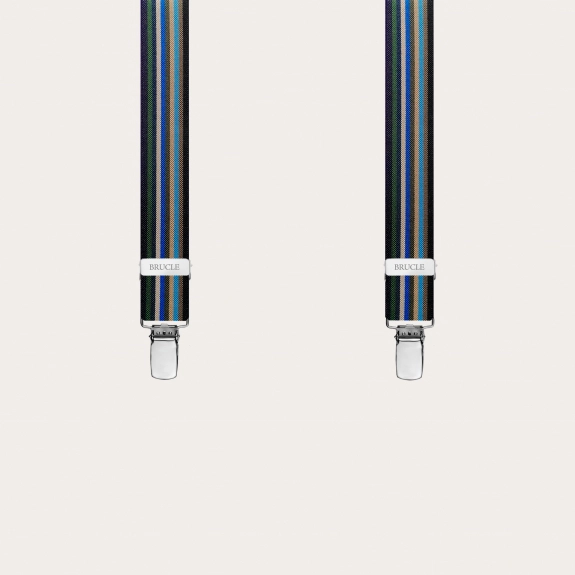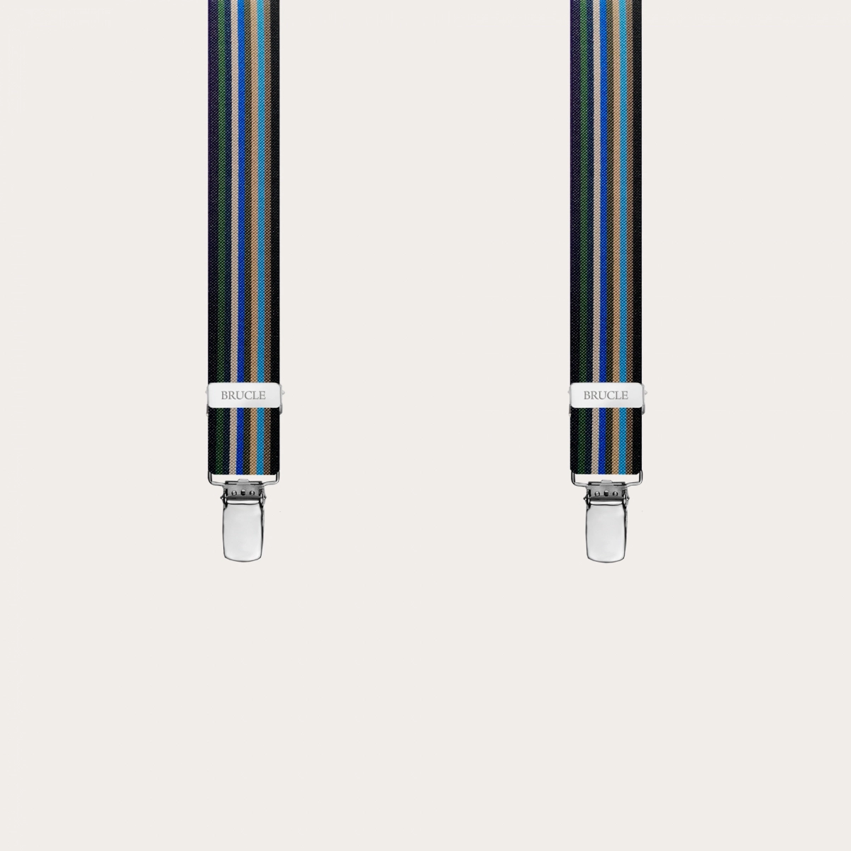 Tirantes elásticos multicolor con rayas verticales, cierre de clip. Un modelo original apto para un look casual y chic, fácil de combinar con cualquier color.