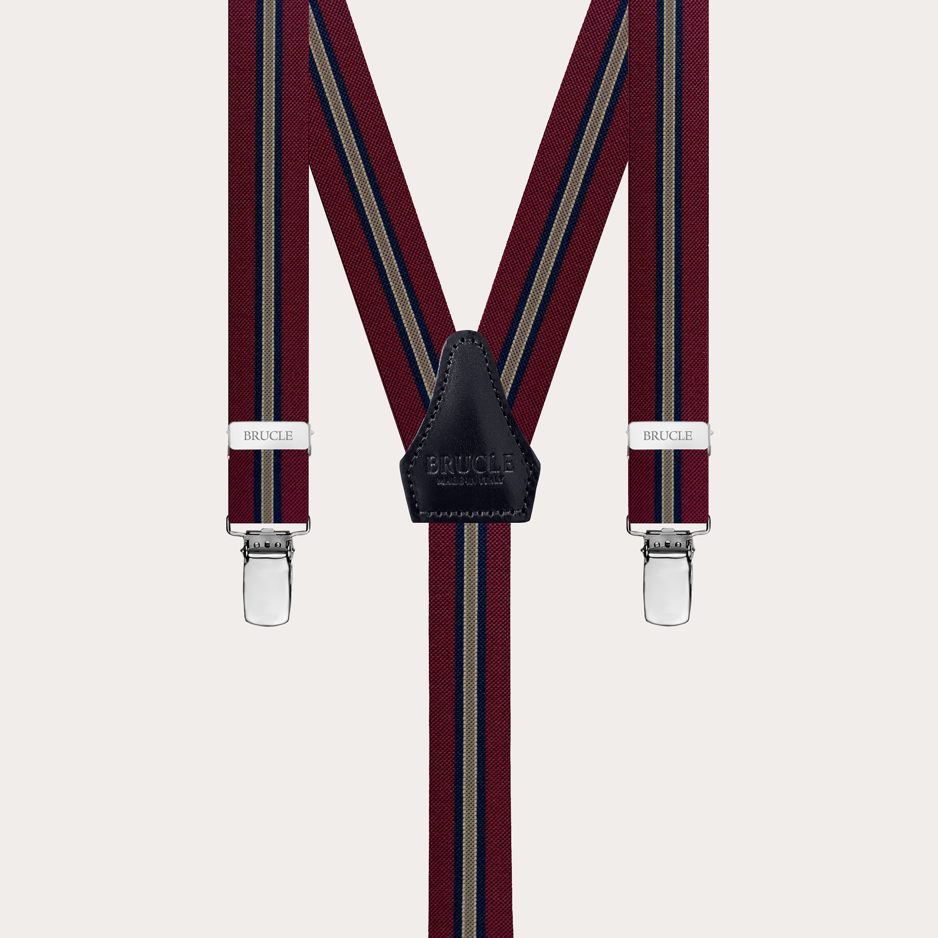 Tirantes regimentales burdeos estrechos en forma de X, con 4 correas y enganche de clip. Un modelo práctico que, gracias a los 4 clips, garantiza el máximo soporte. Estos tirantes también son ajustables y se adaptan a la mayoría de las personas. Sin embargo, gracias al servicio a medida, podemos fabricar tirantes para tallas grandes y personas altas. Estos tirantes también son personalizables con grabados.