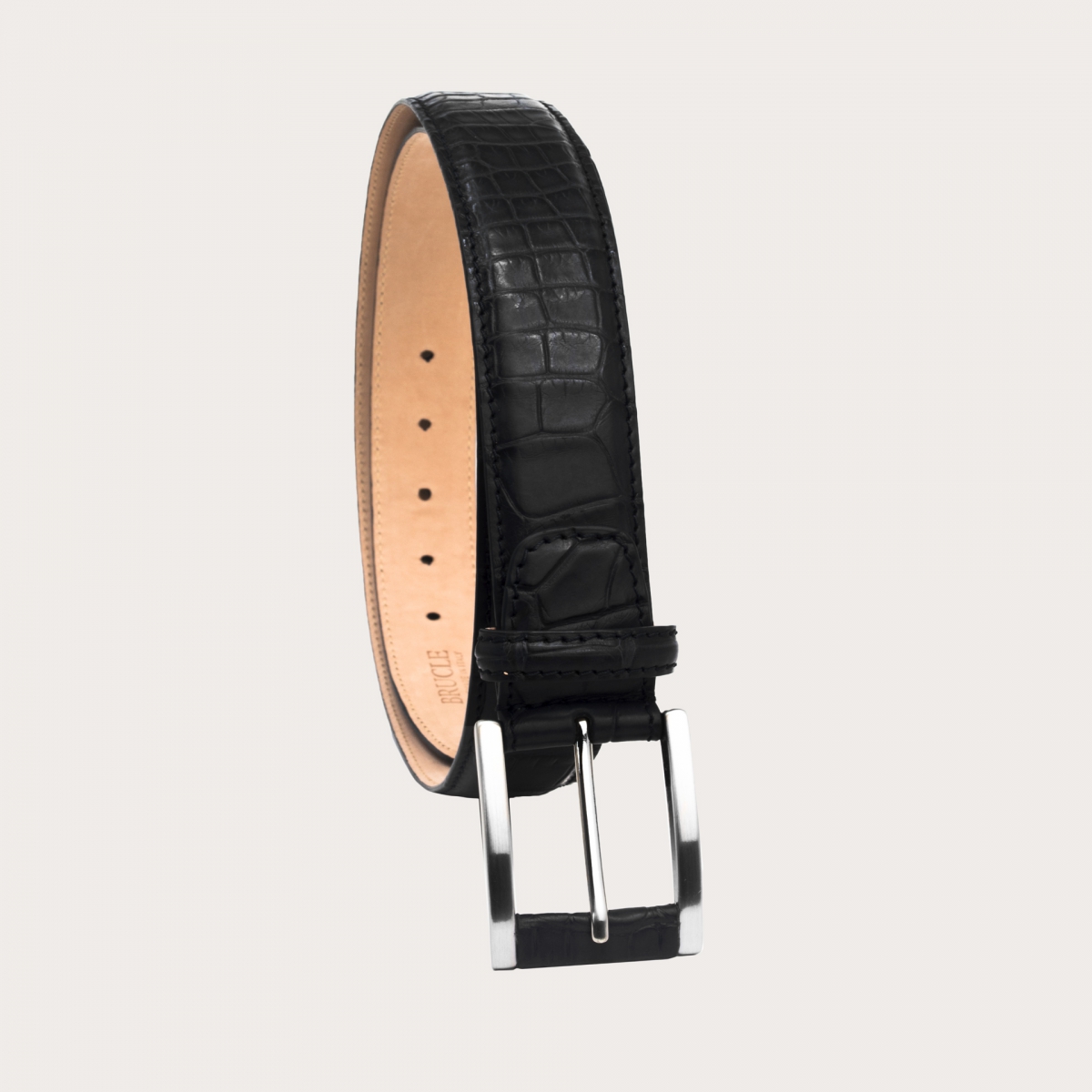 Exclusivo cinturón de hombre en piel de aligátor negro; una joya hecha a mano, completada con una hebilla forrada en piel y pespuntes tono sobre tono. Un accesorio 100% Made in Italy. Descubre la exclusividad y la distinción del cinturón negro de auténtico cocodrilo Brucle. Un accesorio de lujo que combina la artesanía italiana con la belleza intrínseca de un material precioso, para dar un toque de elegancia atemporal a tu estilo.