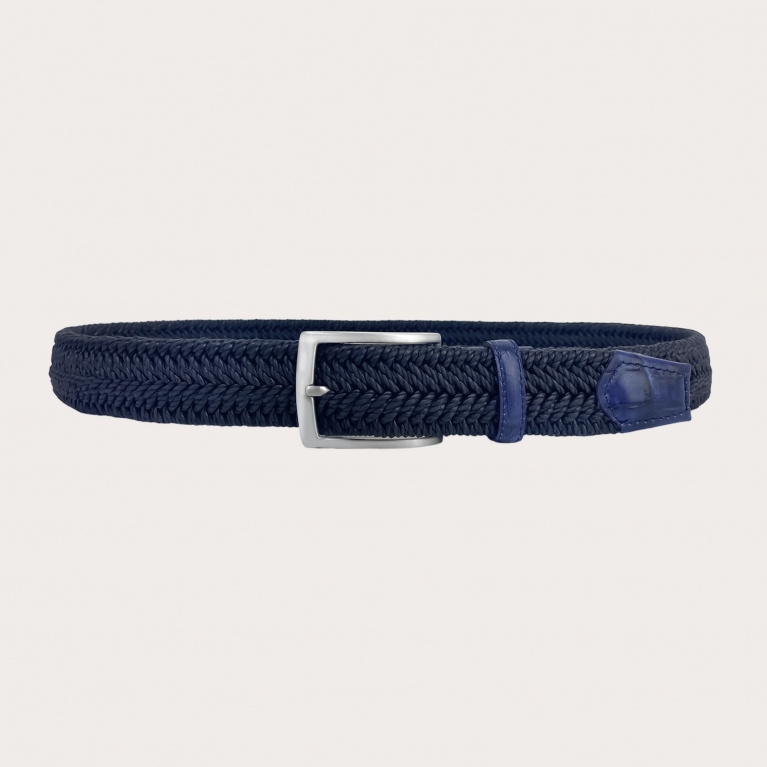 Cinturón trenzado elástico azul melange, con hebilla libre de níquel en acabado rutenio.