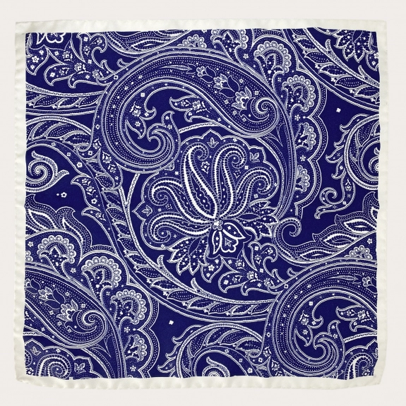 Pañuelo de bolsillo azul marino confeccionado en seda de Como, con borde enrollado y acabado a mano y a máquina. Producido artesanalmente en Italia bajo criterios de sostenibilidad. Un complemento imprescindible para trajes clásicos y eventos formales.