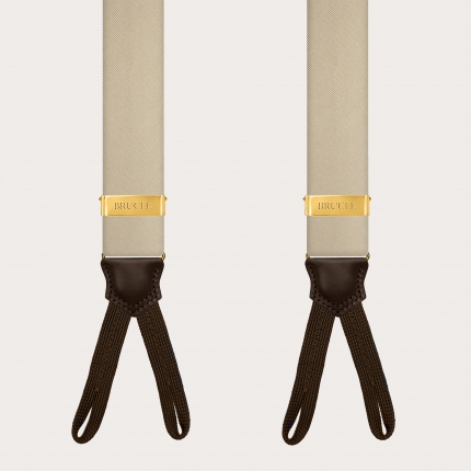 El cierre de ojal en lugar de las puntas es una solución muy práctica para quien usa tirantes a menudo. Menos comunes y por ello más especiales, solo requieren botones, al igual que las puntas de piel. El ojal es de tela y va cosido directamente al tirante.