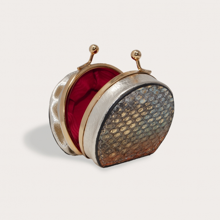 Portefeuille femme zippé exclusif en véritable cuir de python réticulé, dans une élégante teinte vin nuancée à la main.