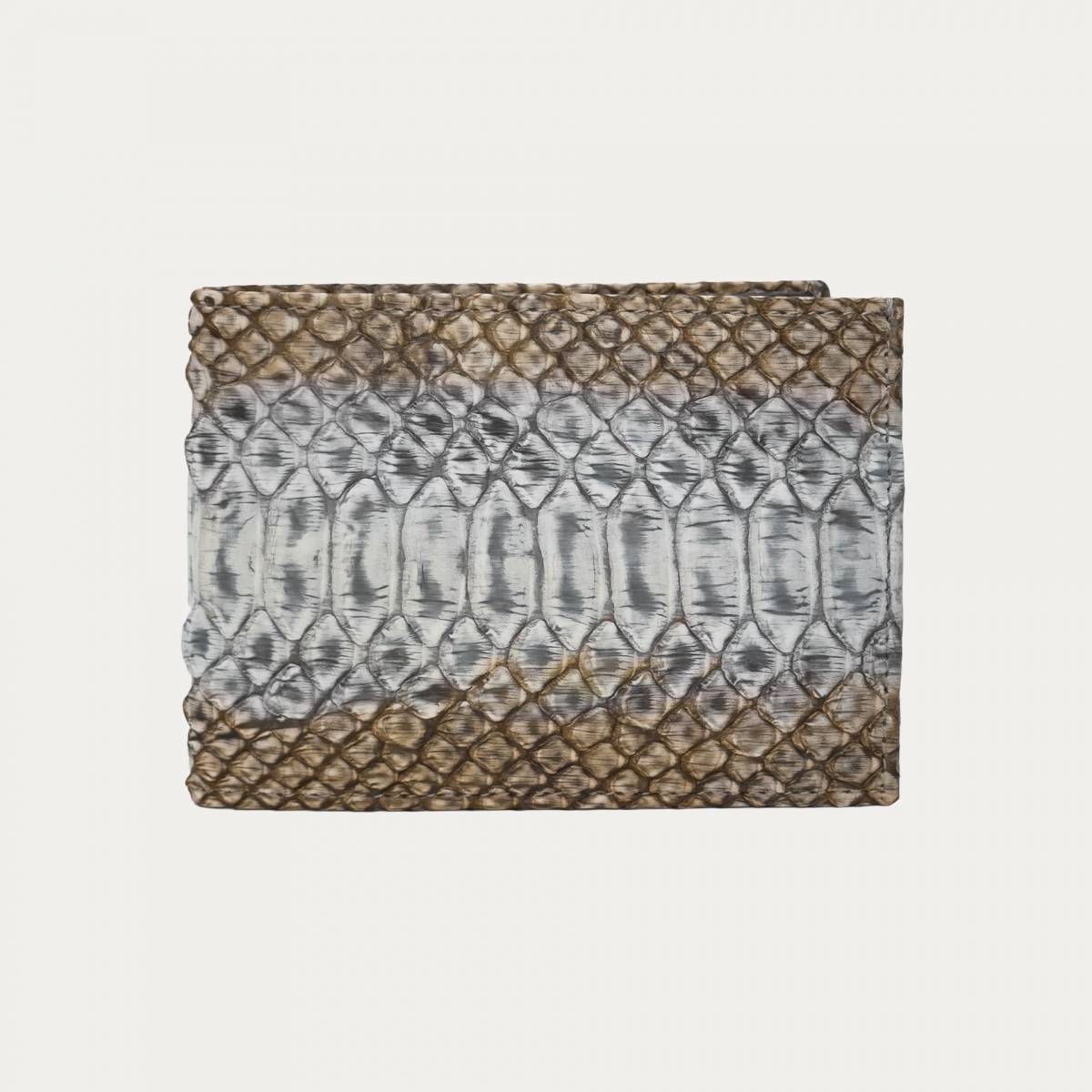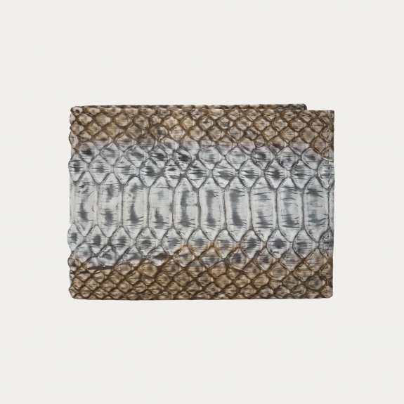 Portefeuille exclusif en véritable cuir de python réticulé effet nubuck, dans une teinte naturelle taupe dégradée vers le bleu clair. Un portefeuille homme spacieux, pouvant contenir jusqu'à 8 cartes de crédit, avec double compartiment pour billets et poches pour documents. Fait main en Italie avec les plus beaux cuirs de python certifiés CITES, il est soigné dans les moindres détails. Découvrez les personnalisations gratuites disponibles pour le rendre encore plus unique, ou comme idée cadeau parfaite pour vos proches.