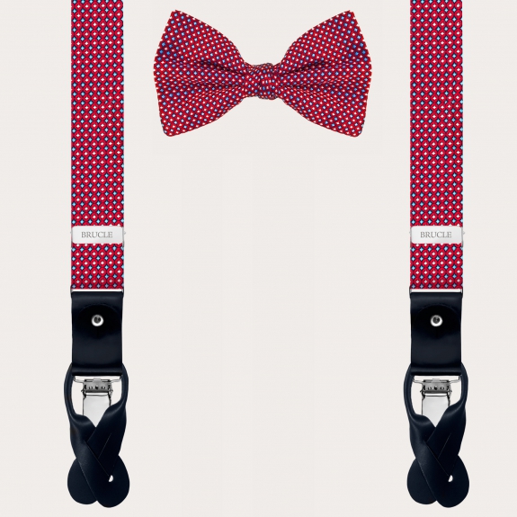 Paquet composé de bretelles et noeud papillon en soie italienne; un modèle en soie rouge jacquard avec des micro-dessins. Élégance et originalité 100% Made in Italy.