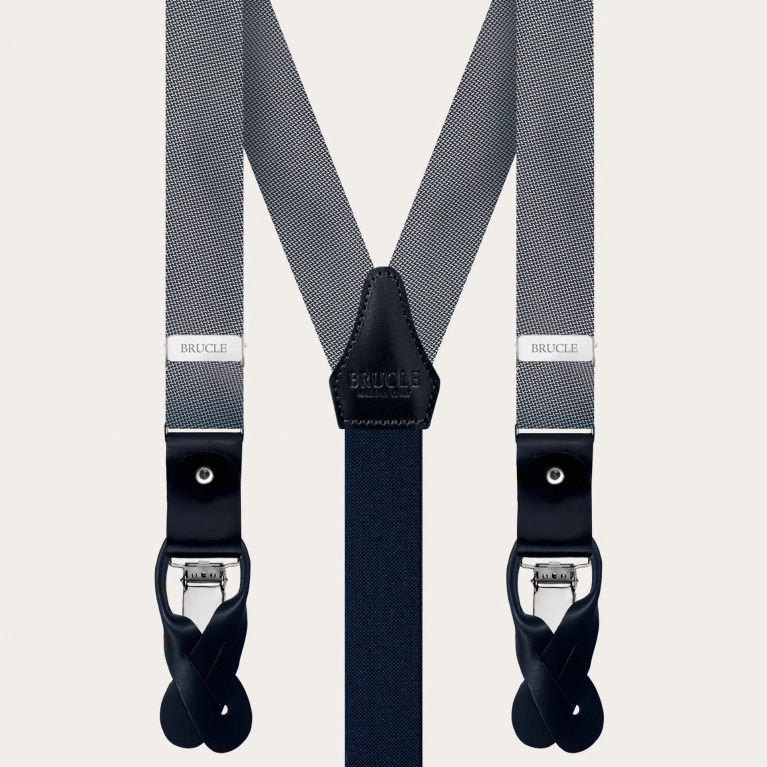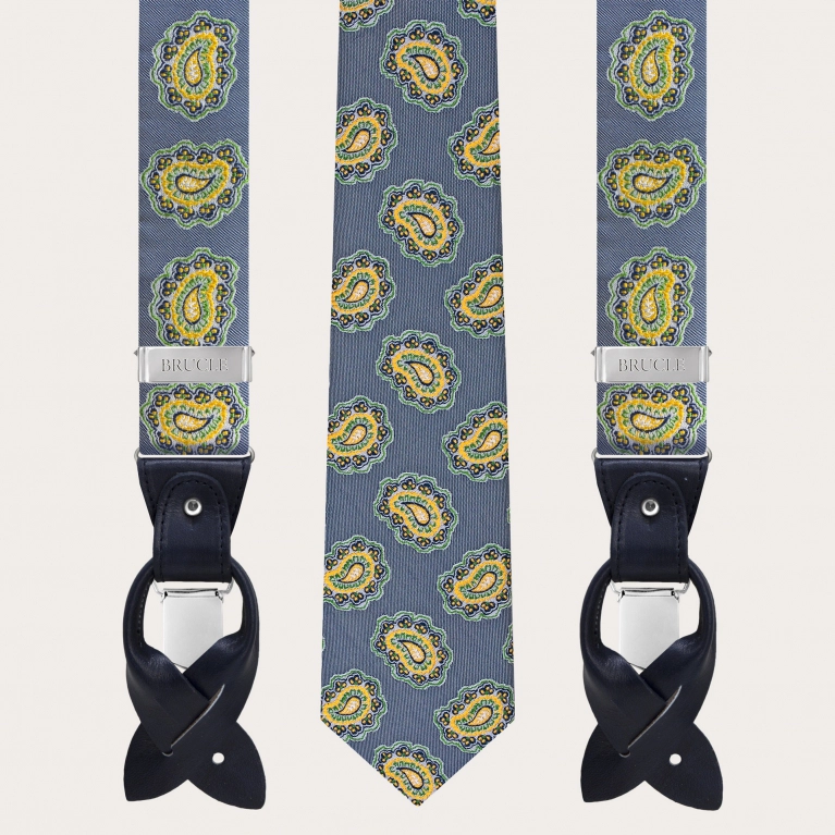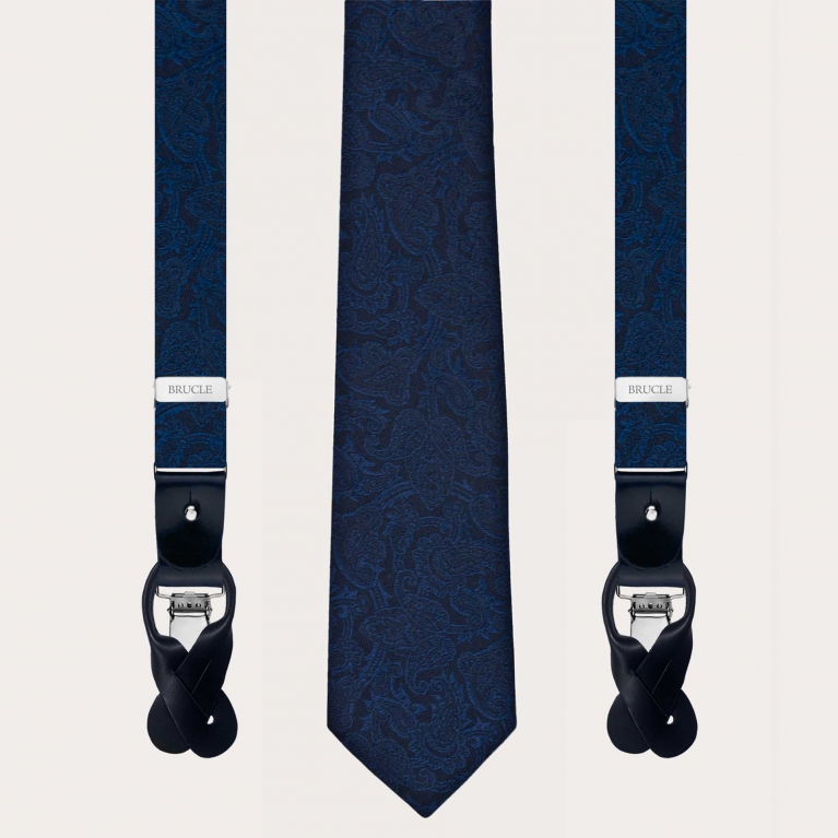 Bretelles et cravate homme assorties en élégant jacquard de soie bleu. Un ensemble parfait pour les cérémonies et les soirées élégantes.