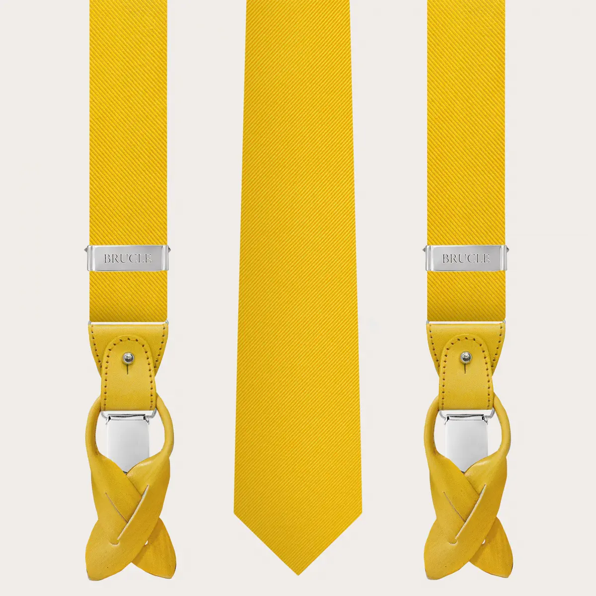 Élégant et vif ensemble de bretelles en soie et cravate en soie jaune assortie, pour un look raffiné, parfait pour impressionner. Les bretelles peuvent être portées soit avec des clips pratiques, soit avec des embouts en cuir pour boutons, personnalisables avec des gravures. La cravate à 3 plis, d'une largeur classique de 8 cm, ajoute de l'élégance et du raffinement à votre tenue. La couleur jaune intense met en valeur la beauté et la brillance de la soie de haute qualité tissée à Côme.