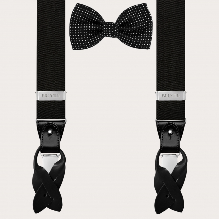 Ensemble élégant dans les tons de noir et d'argent, capable de donner de la lumière et de l'élégance aux tenues de toutes les couleurs. Bretelles et nœud papillon fabriqués avec des soies italiennes du district de Côme, 100% Made in Italy.
