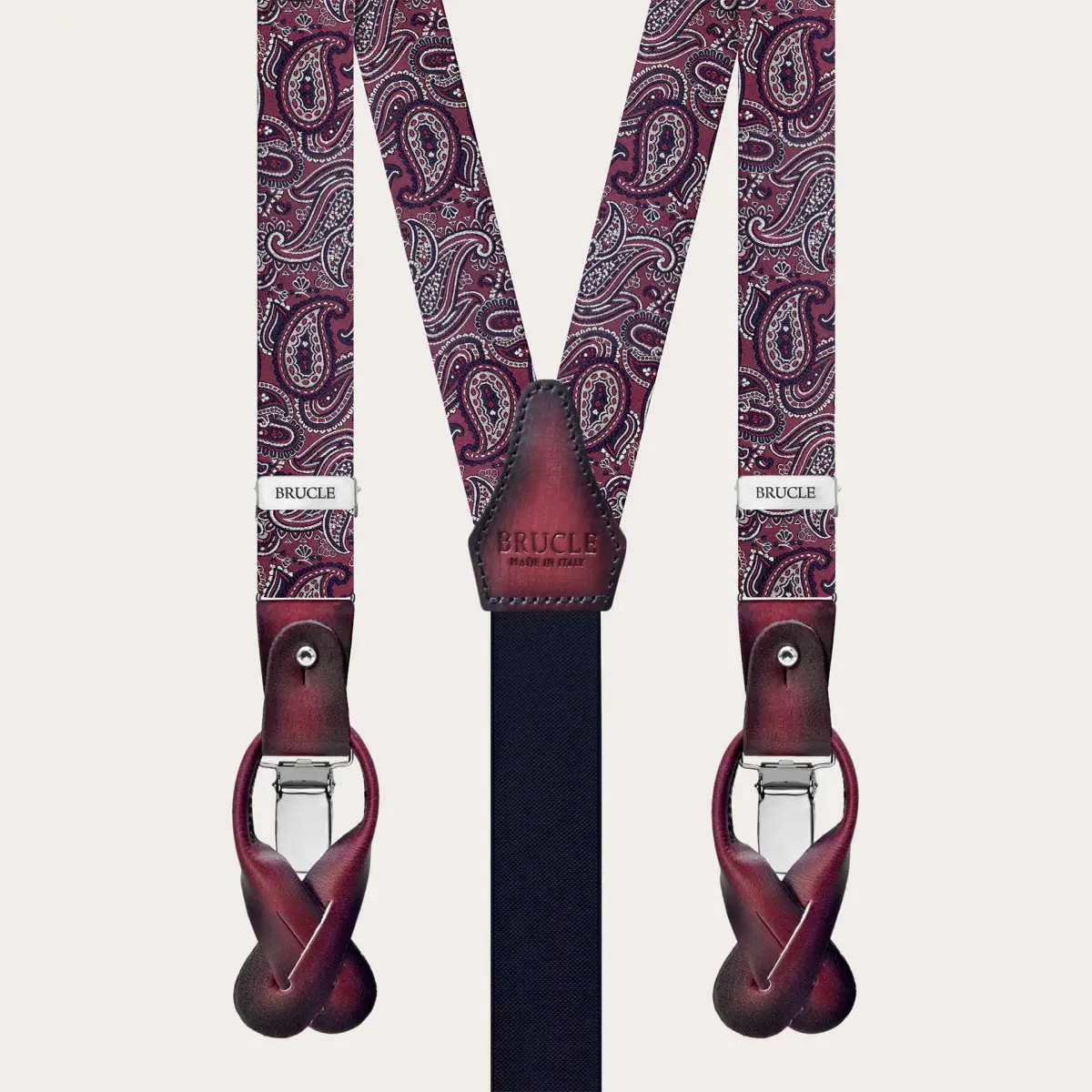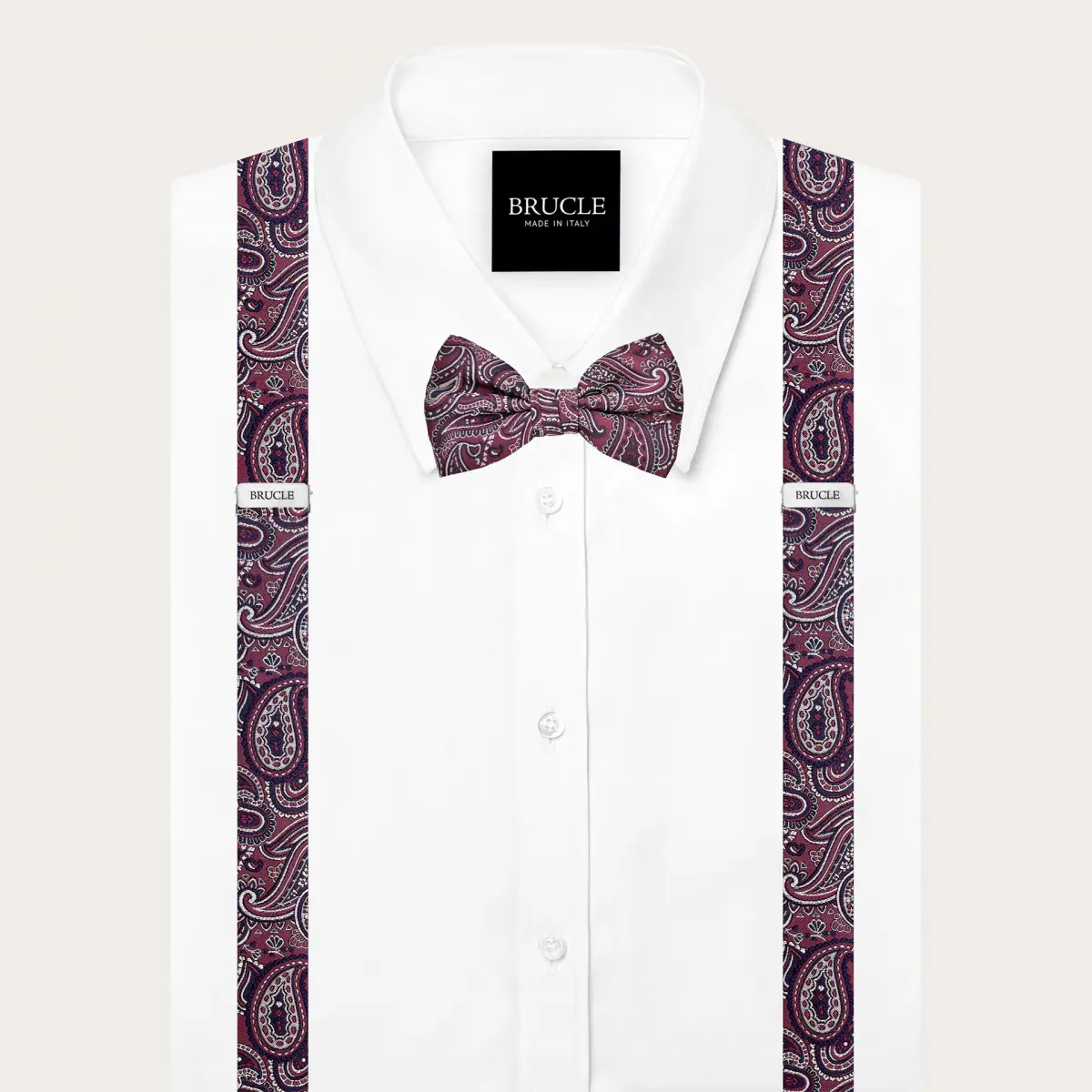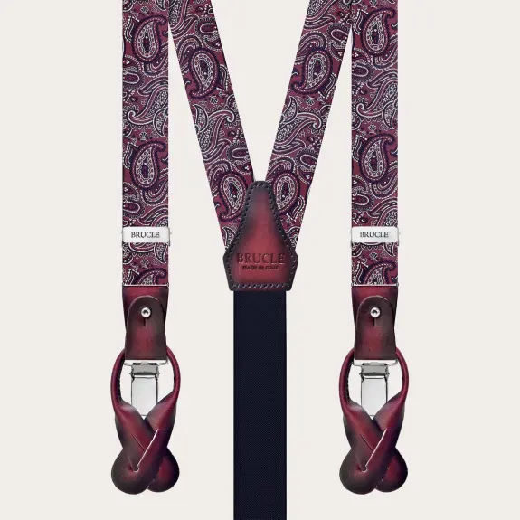 Ensemble original de bretelles et nœud papillon pour homme, composé de bretelles fines en soie pour boutons ou clips et d’un nœud papillon déjà noué réalisé dans la même soie, avec un élégant motif macro paisley.