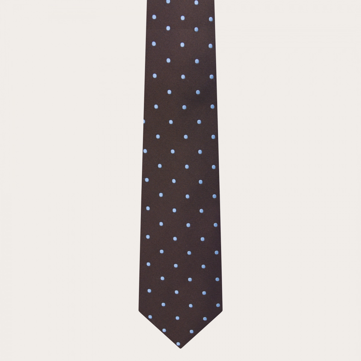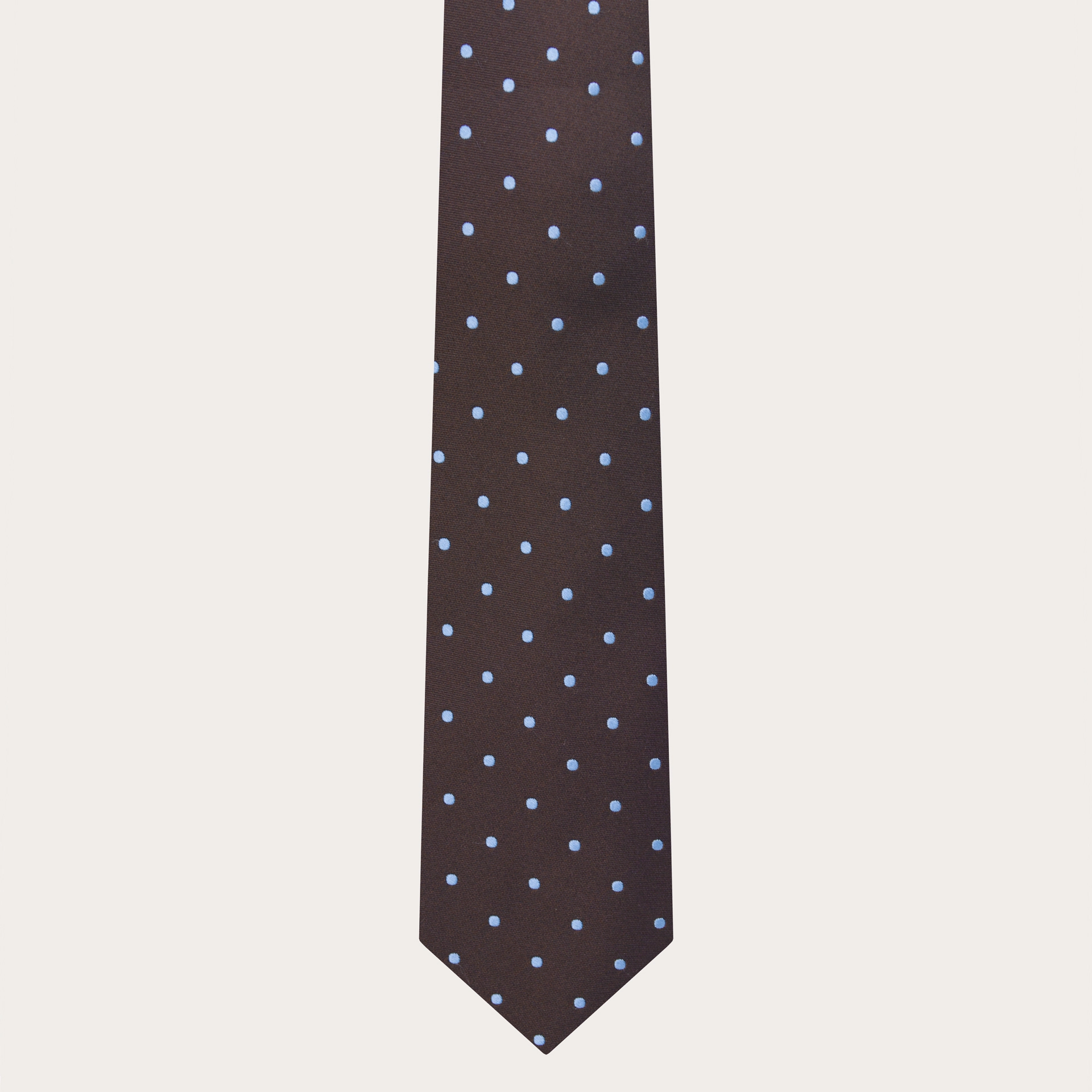 Élégante cravate en soie diamantine marron au motif à pois discrets, qui met en valeur les reflets du tissu par un jeu de lumière subtil et raffiné.