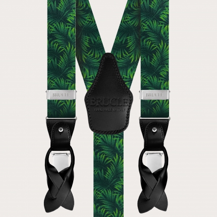Bretelles élastiques lumineuses avec un motif végétal dans les tons de vert. Un motif qui rappelle le cycle de la vie qui renaît à travers des illustrations au charme ancien. 100% fabriqué en Italie.