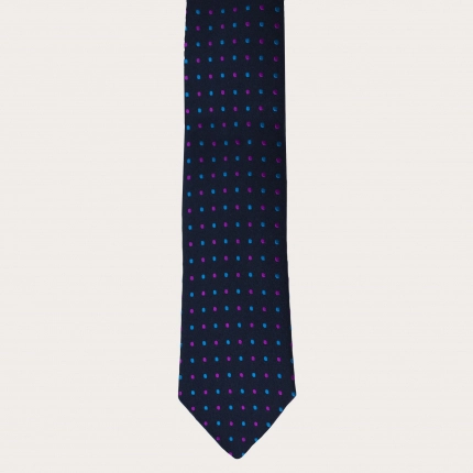 Cravate élégante en soie et coton à motif à pois, bleu marine, bleu clair et fuchsia