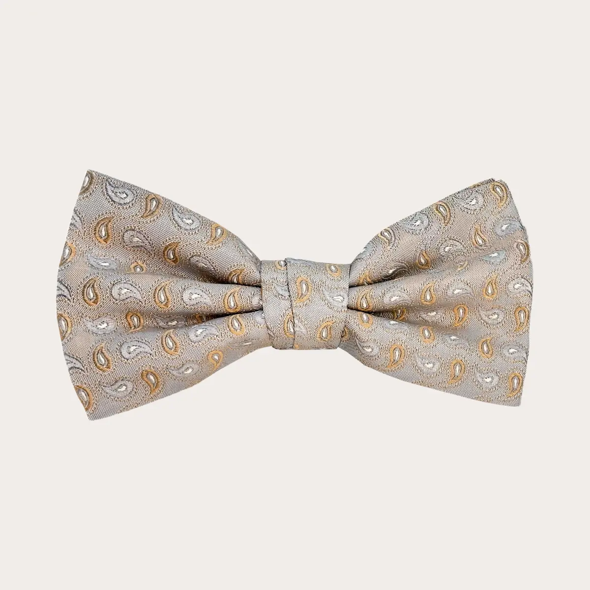 Nœud papillon en soie jacquard à motif cachemire, dans des tons dorés et argentés.