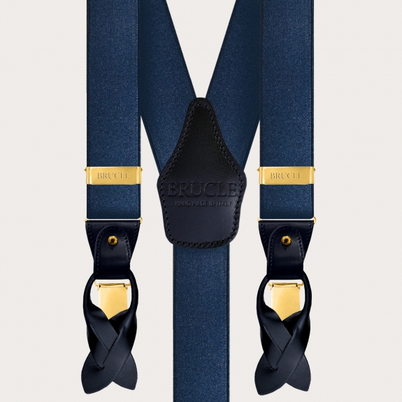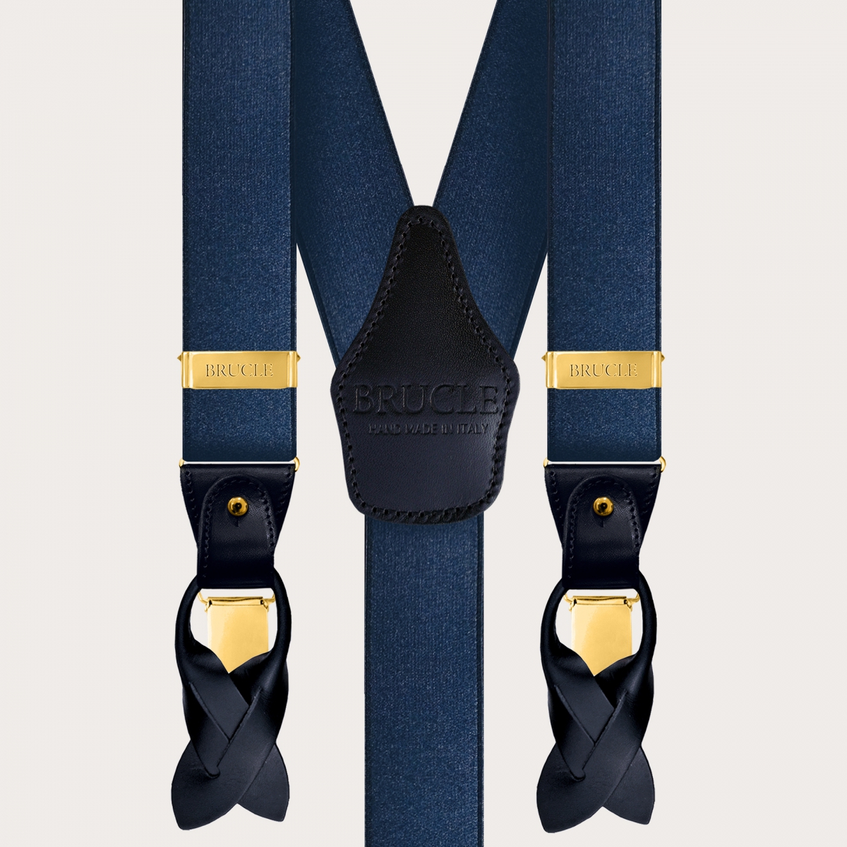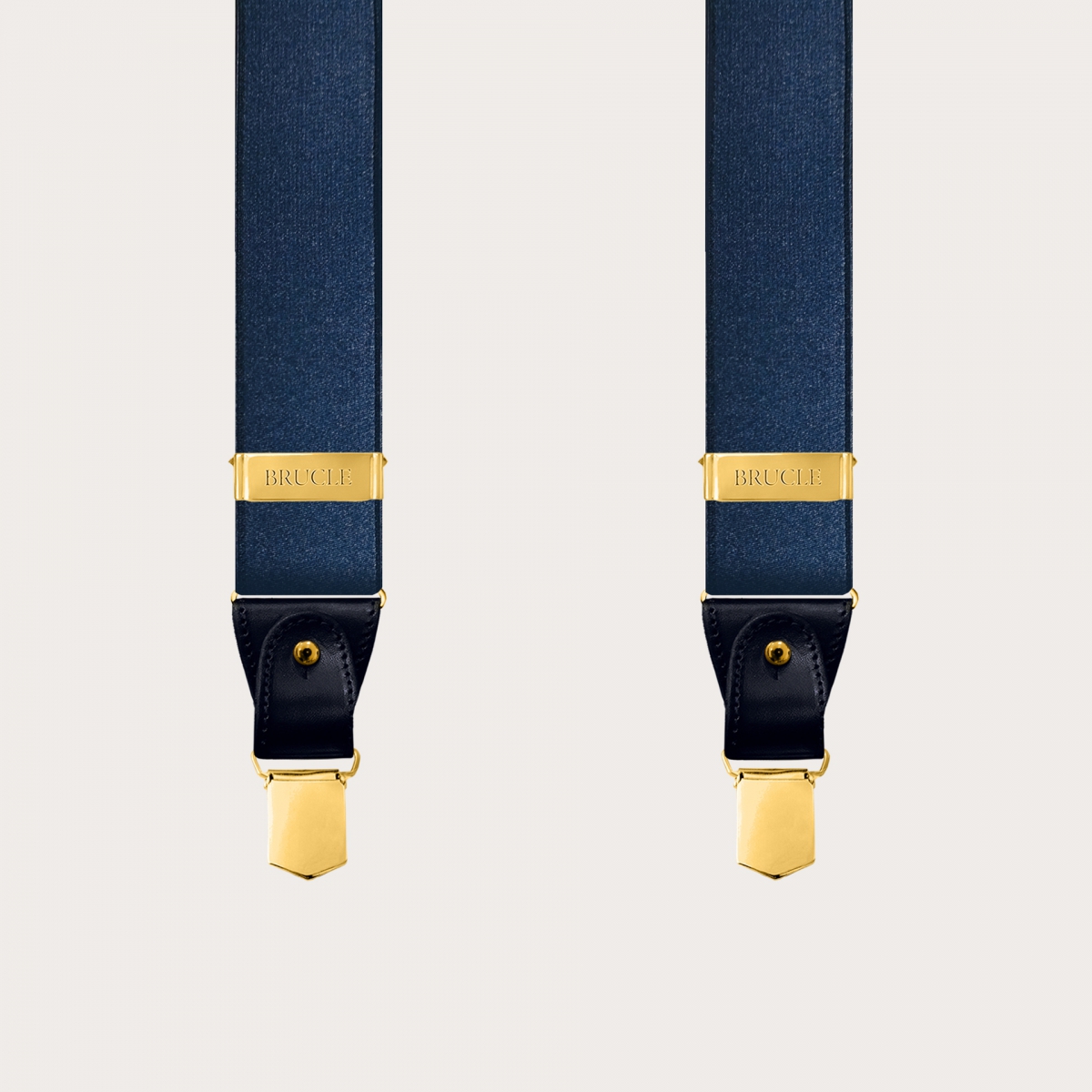 Ajoutez une touche de classe et de personnalité à vos looks les plus élégants avec ces bretelles en satin élastique bleu. La finition dorée des clips apporte une touche de raffinement, tandis que les détails en cuir véritable ajoutent une note unique et exclusive.
