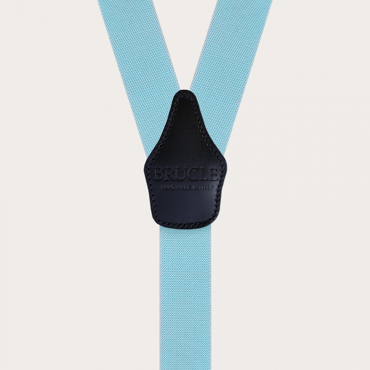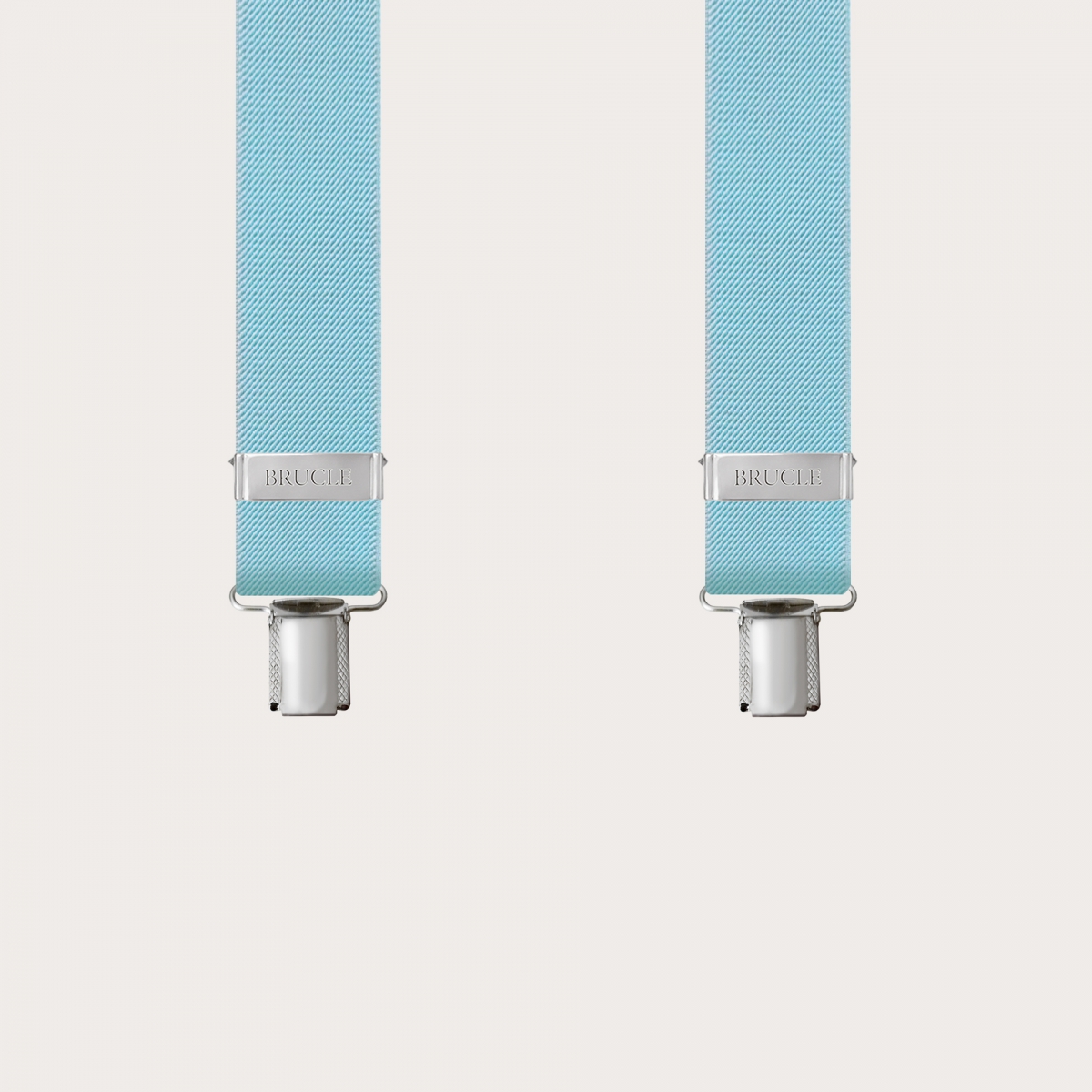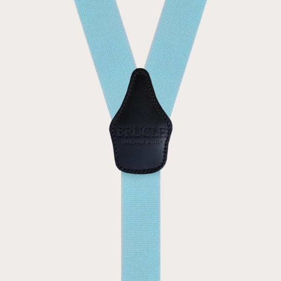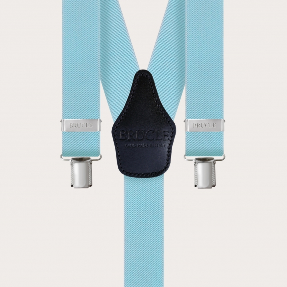 Style : Bretelles en forme de Y avec attache à pinces Composition élastique : Polyester 85 % Élastodiène 15 % Largeur : 36 mm Longueur réglable : 120 cm Couleur : bleu clair Couleur des pinces : argent Fabrication : entièrement faite à la main en Italie Emballage : livrées dans un coffret élégant fabriqué en Italie en carton recyclable certifié FSCFabriquées avec des matériaux de première qualité