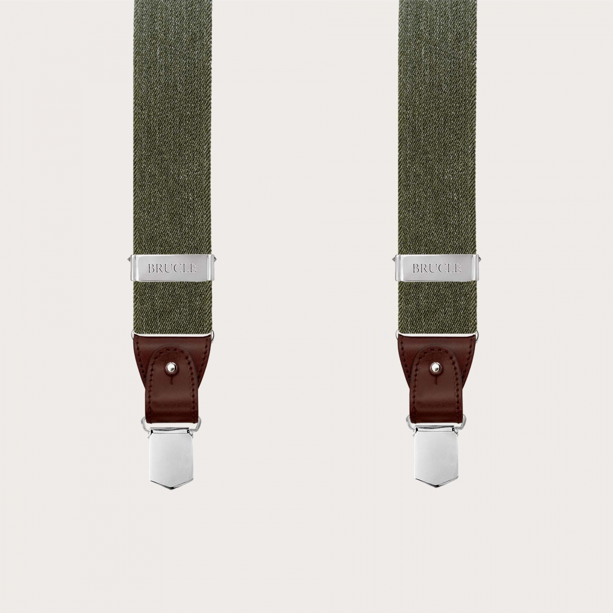 Bretelles élastiques avec bande effet jeans de couleur verte. Grâce à leur forme en Y avec double usage, elles peuvent être portées avec des boutons ou des clips, pour un style plus recherché ou pratique.