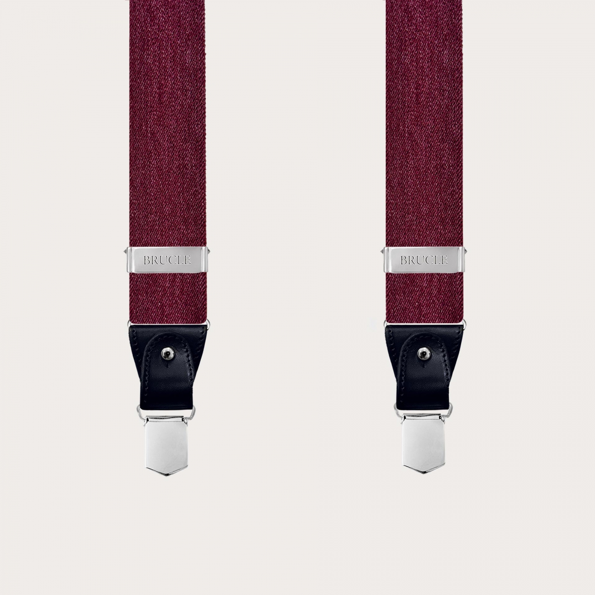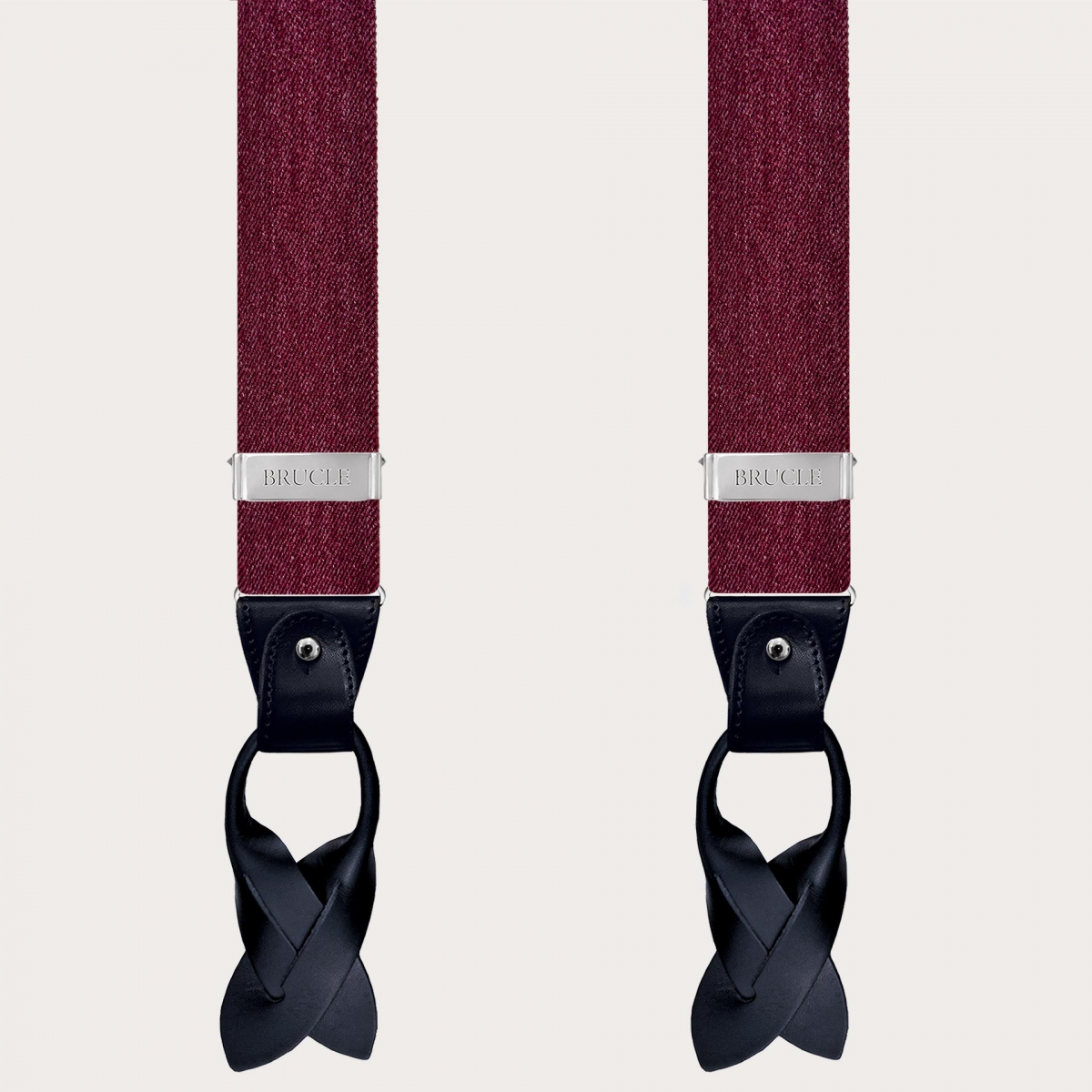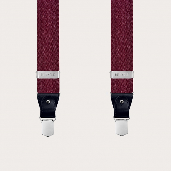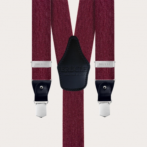 Bretelles bordeaux en élastique bordeaux effet jeans finies avec des parties en cuir noir, créant un contraste élégant.