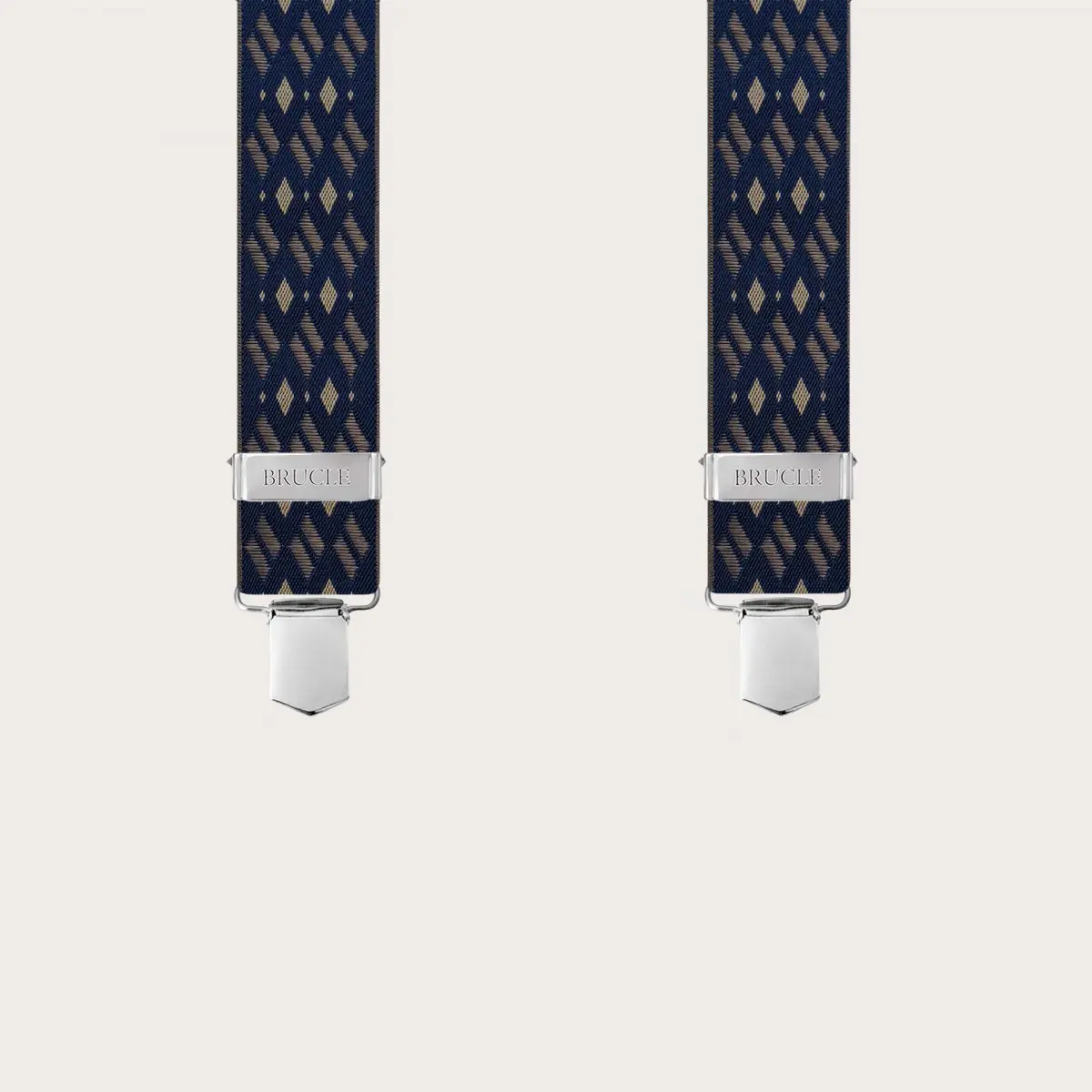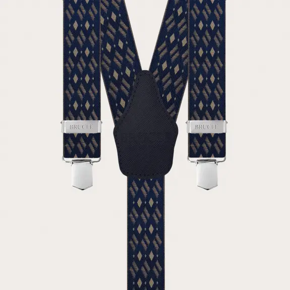 Bretelles bleues avec motif losanges beige, un modèle élégant et raffiné, au design simple et minimaliste. Fabriquées à la main en Italie avec les meilleurs matériaux, elles sont personnalisables avec des gravures sur les clips. Ces bretelles pour homme particulières conviennent à un look élégant et formel. Disponibles également en forme de X avec double jambe arrière et pour boutons.