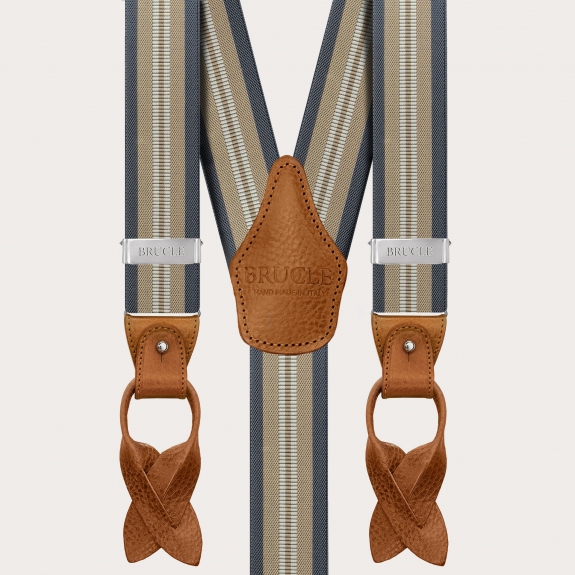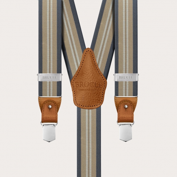 Bretelles beiges à rayures bleues avec finitions en cuir grainé assorti et pièces métalliques sans nickel. Un modèle de bretelles polyvalent, unisexe et au design surprenant. Grâce aux languettes amovibles, ces bretelles peuvent être portées avec des passants en cuir pour boutons ou avec des pinces, selon les différentes occasions. Personnalisables avec des gravures.