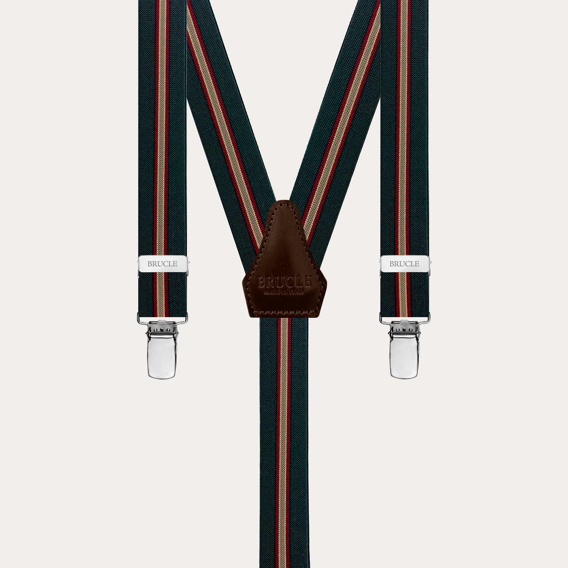 Bretelles vert régimentaire avec attache par clip en élastique étroit. Un motif original qui réinterprète le classique régimentaire. Polyvalent et facile à assortir, il est disponible en plusieurs couleurs. Un modèle de bretelles unisex, personnalisable avec des gravures sur les clips. Découvrez toute la collection de bretelles homme et femme de Brucle.