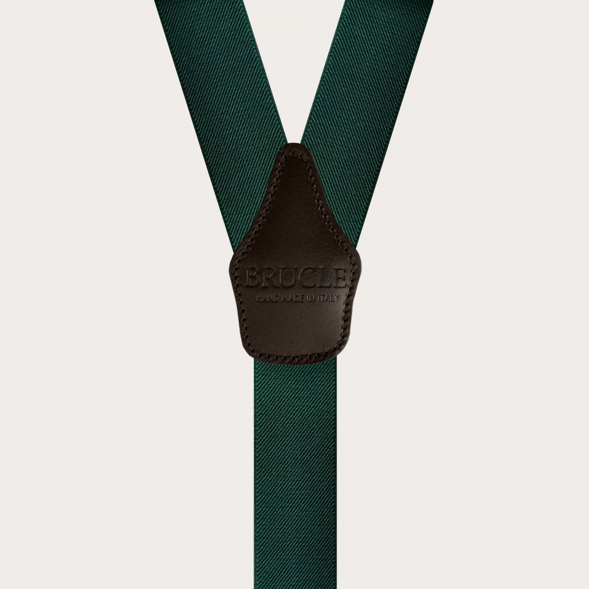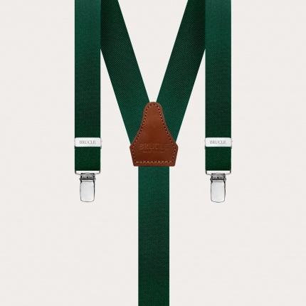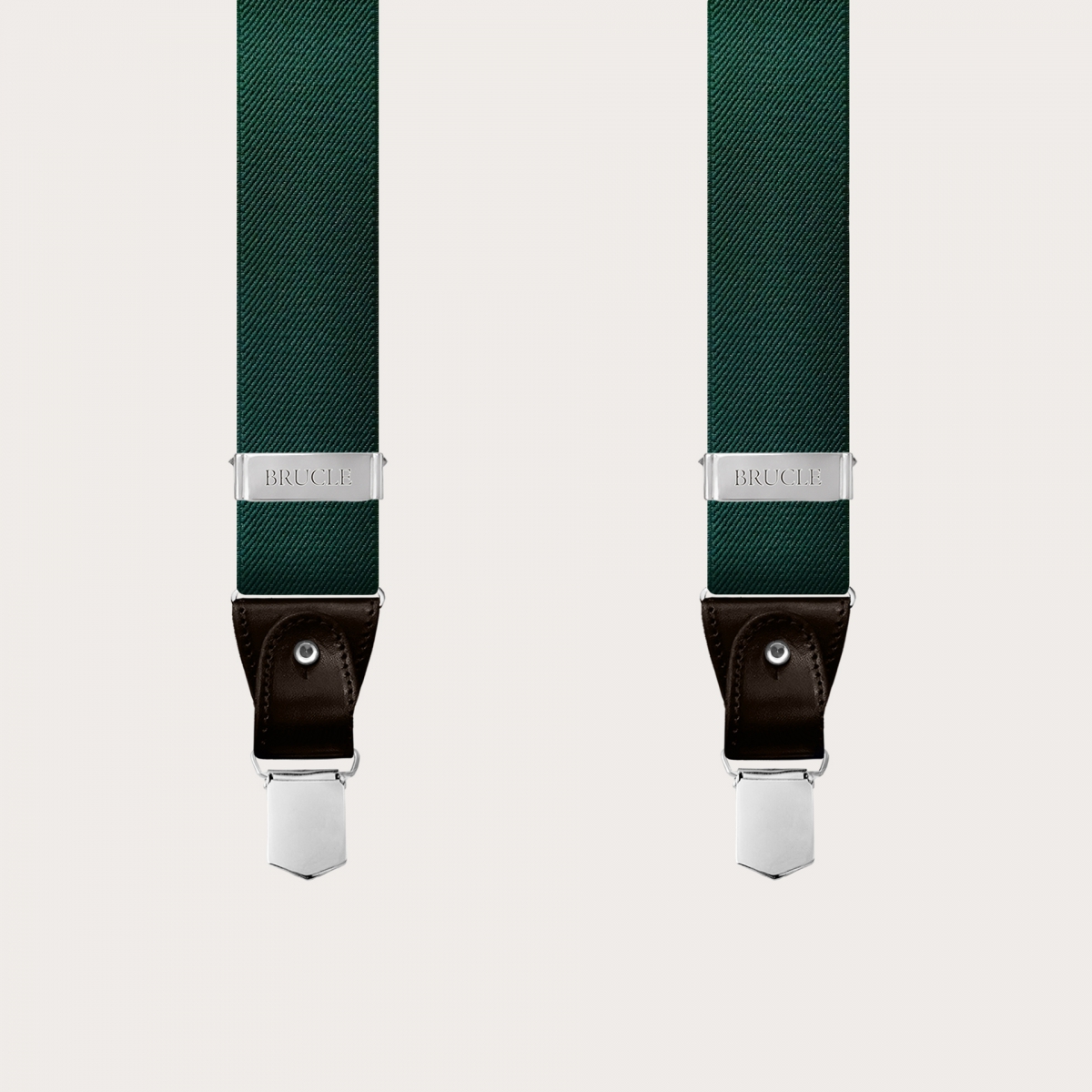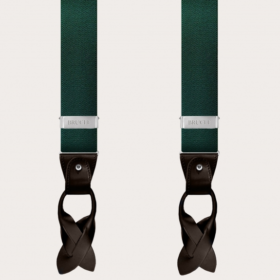 Les bretelles vertes Brucle sont un symbole de raffinement et de souci du détail, idéales pour ceux qui souhaitent se démarquer et ajouter une touche de couleur à leur garde-robe. La nuance verte vibrante insuffle énergie et vitalité, sublimant votre style et ajoutant un élément de charme inimitable, rehaussé par le contraste avec les parties en cuir marron foncé et les parties métalliques argentées sans nickel.