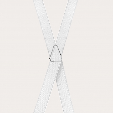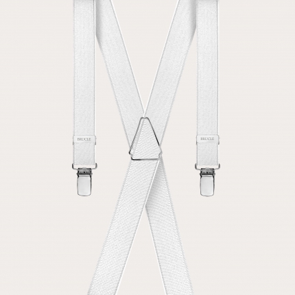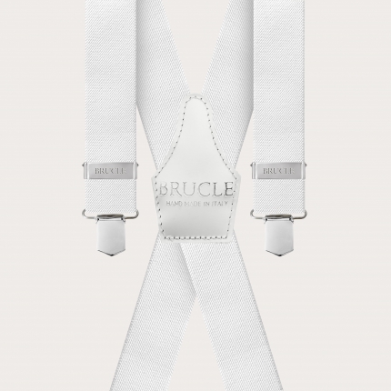 Bretelles élégantes blanches à double usage sans nickel. Un modèle élégant et intemporel qui ne renonce pas au confort des bretelles élastiques. Portable aussi bien avec l'attache clip qu'avec l'attache moustache pour un modèle adaptable à tous vos besoins d'élégance. Cet accessoire élégant et exclusif est le choix parfait pour compléter votre tenue avec un style sophistiqué, assurant un confort et une qualité inégalés. Un produit 100% Made in Italy.