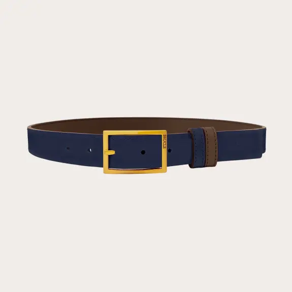 Ceinture réversible en saffiano brun foncé et cuir bleu, sans nickel