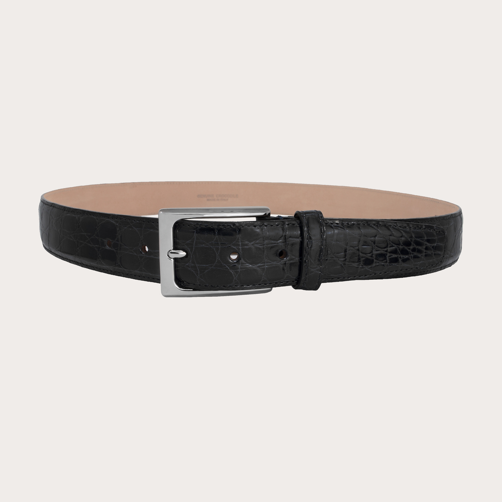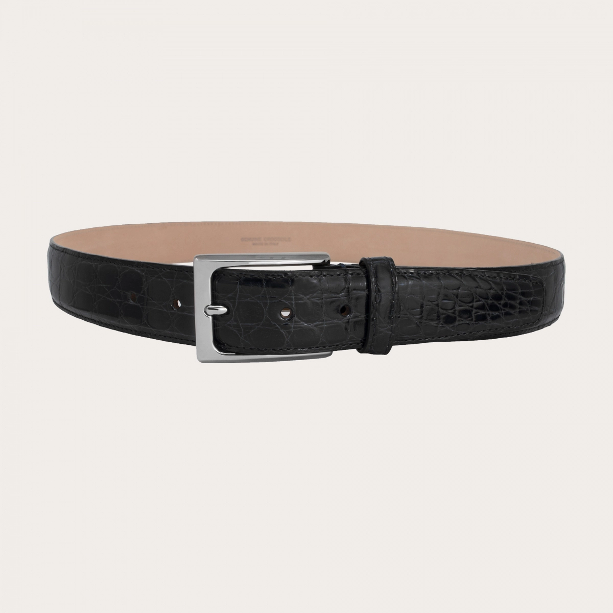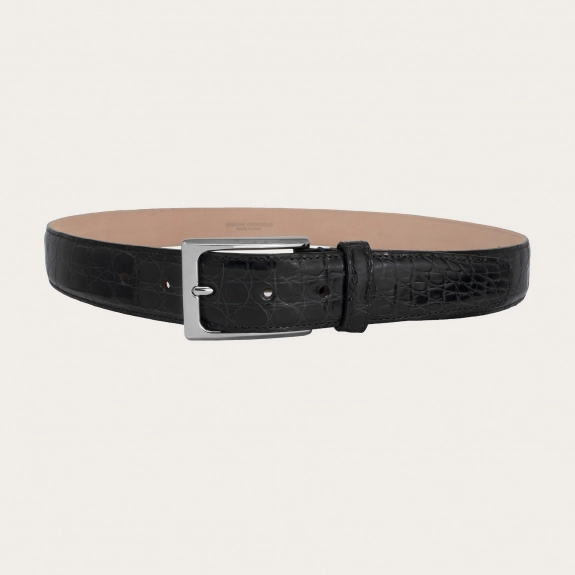 Ceinture en crocodile véritable, réalisée avec le côté, la partie la plus précieuse. Élégant dans la couleur noire classique qui met en valeur le cuir, il est fini avec les meilleurs matériaux pour la doublure et la boucle.