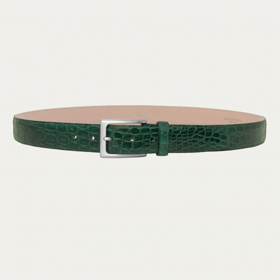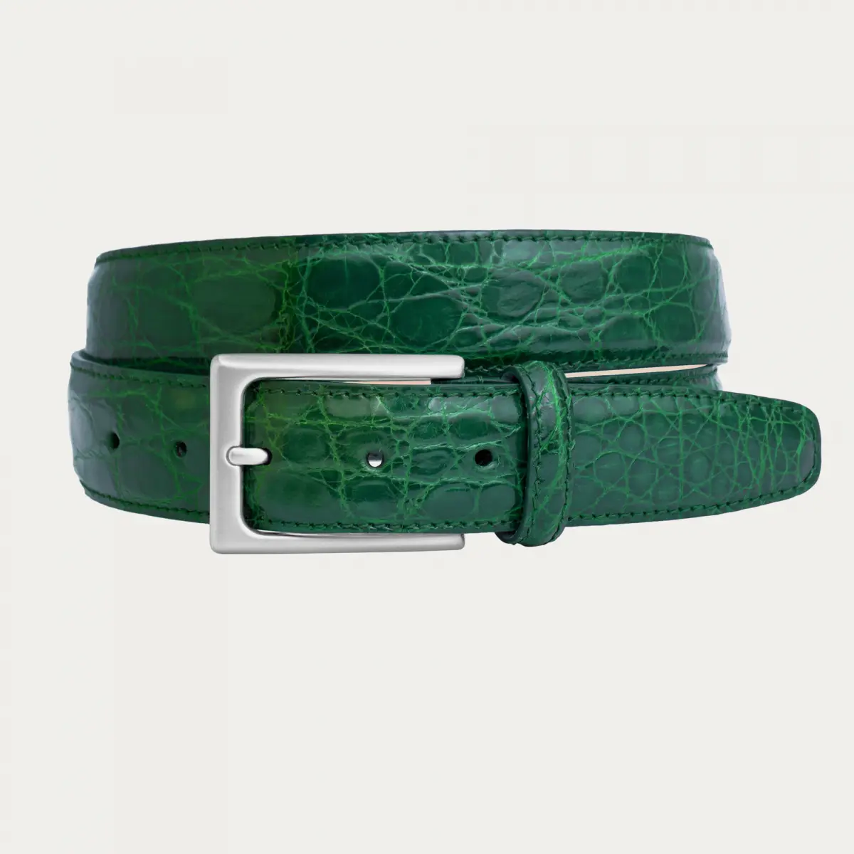Ceinture en crocodile verte réalisée à partir du flanc, l'une des parties les plus précieuses, et finie avec des coutures ton sur ton et une boucle carrée en laiton massif.