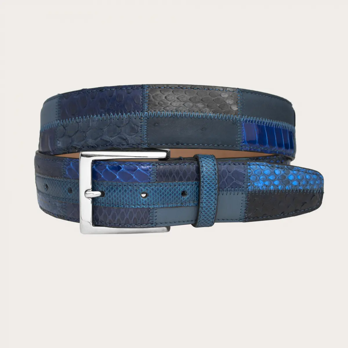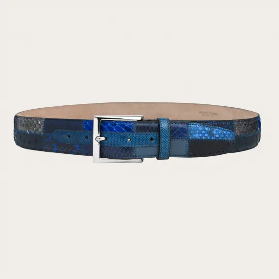 Ceinture bleu en cuir de python véritable, patchwork 100% Made in Italy réalisée par nos meilleurs artisans.