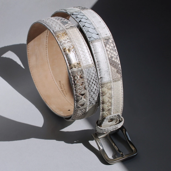 Ceinture en python véritable fabriquée à la main en Italie avec patchwork dans des tons clairs de blanc et de gris roche. Une ceinture parfaite pour l'été et pour un look ensoleillé.