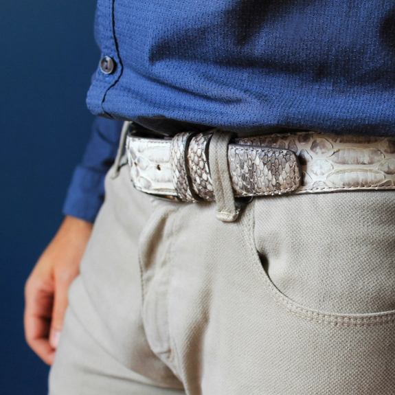Ceinture mixte en cuir de python véritable blanche, cousue main en Italie. Fabriquée à l'aide de nos meilleurs matériaux. Une ceinture originale et élégante pour toute occasion.