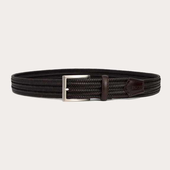 Ceinture élastique tressée marron foncé en cuir régénéré, faite à la main avec des finitions en cuir véritable et une boucle en laiton brillant.