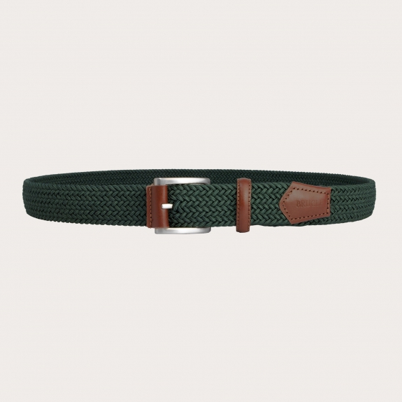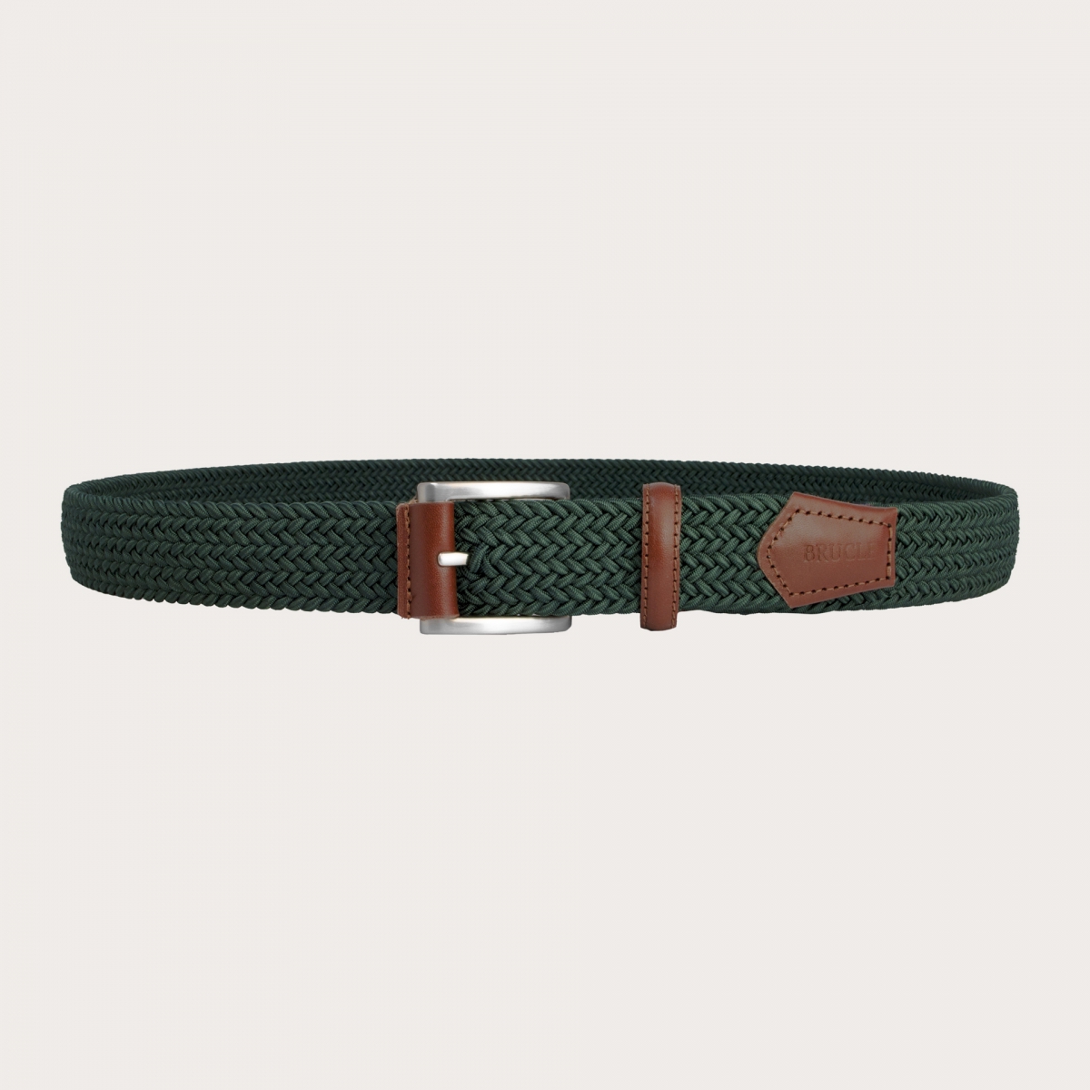 Ceinture en coton élastique tressé vert, avec boucle recouverte de cuir de vachette souple couleur érable. Confortable et facile à porter, parfait pour les tenues décontractées.