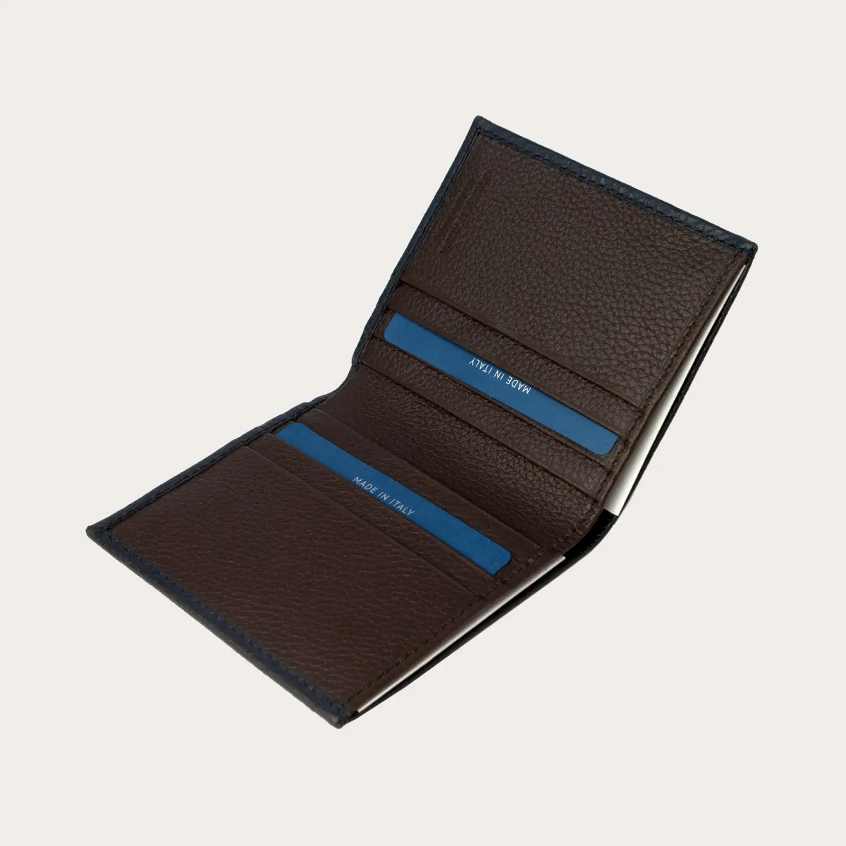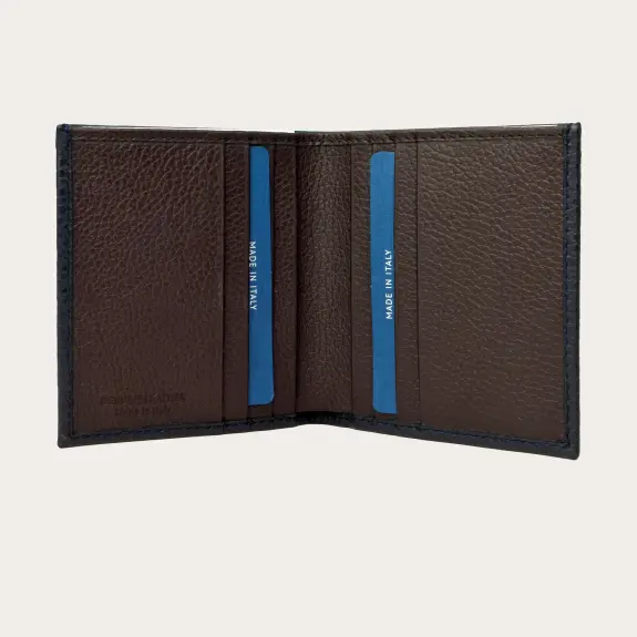 Elégant portefeuille business en cuir souple bleu marine, avec intérieur et doublure marron foncé. Un modèle élégant et tendance, parfait pour transporter l'essentiel, que ce soit dans la poche de votre veste ou dans un petit sac à main, sans renoncer à la classe d'un produit en cuir 100% Made in Italy.