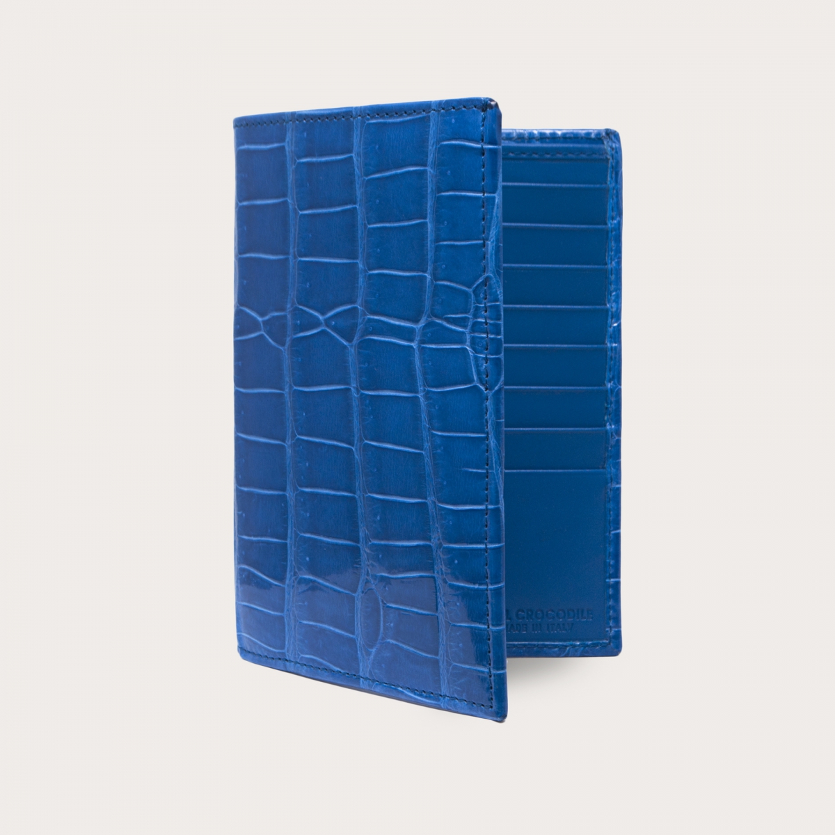 Plongez dans le charme intemporel de notre portefeuille porte-passeport pour hommes en bleu royal, fabriqué à la main en précieux cuir de crocodile porosus. Cet accessoire de luxe, témoignage du savoir-faire artisanal italien, est l'objet parfait pour l'homme qui cherche à se démarquer avec élégance et audace.