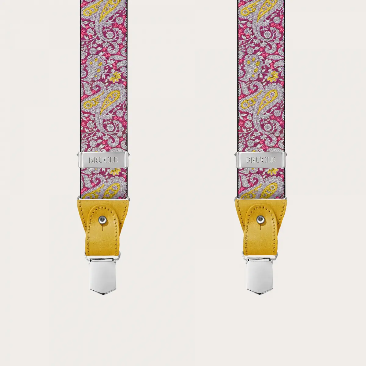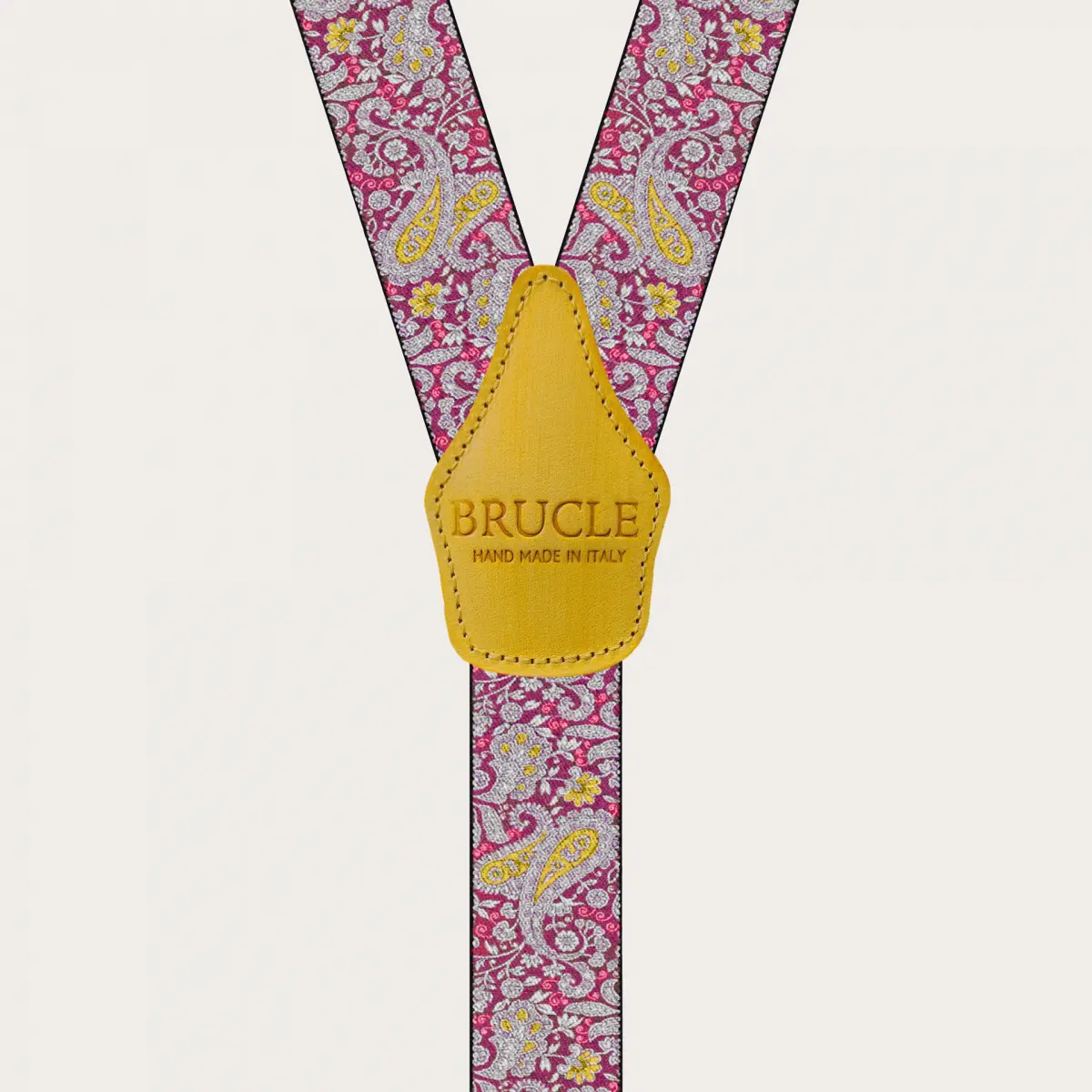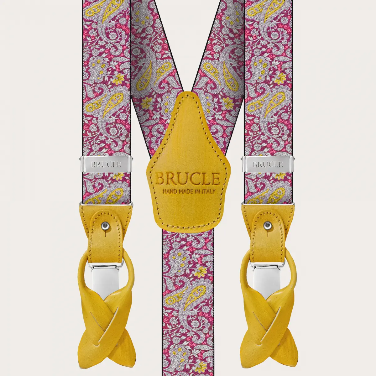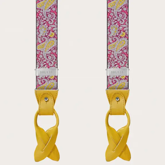 Bretelles double usage à motif paisley avec un motif paisley magenta et jaune vif et raffiné, rendu unique par des parties en cuir jaune colorées à la main. Un modèle sans nickel, 100% Made in Italy.