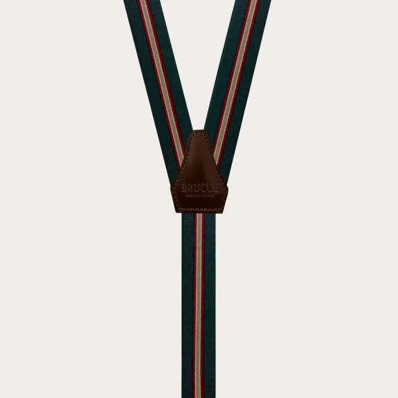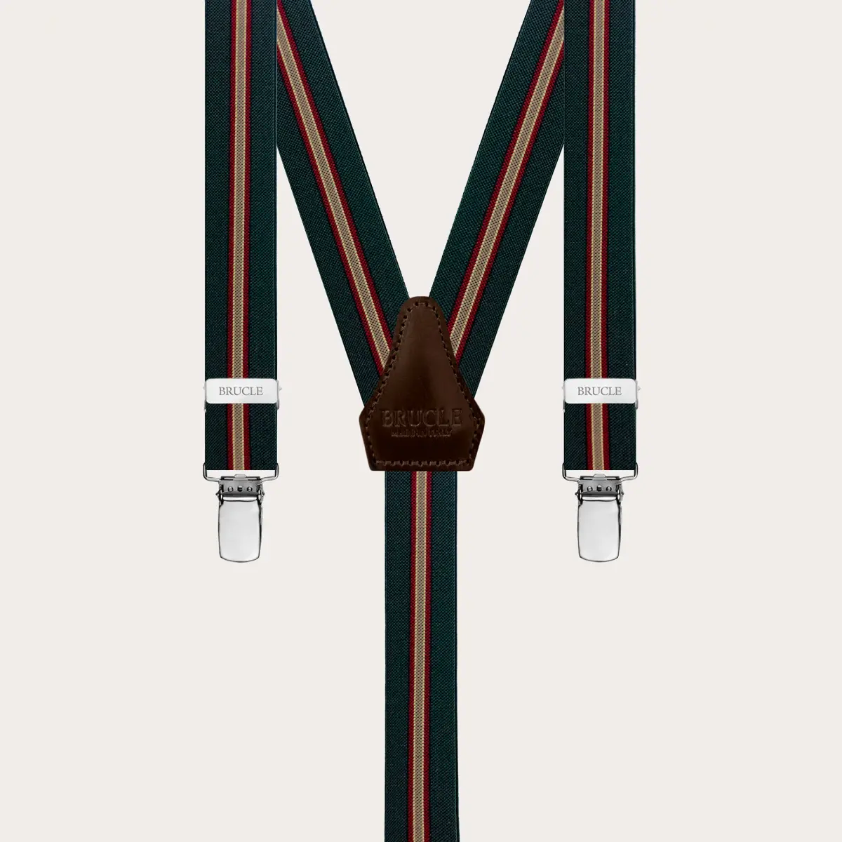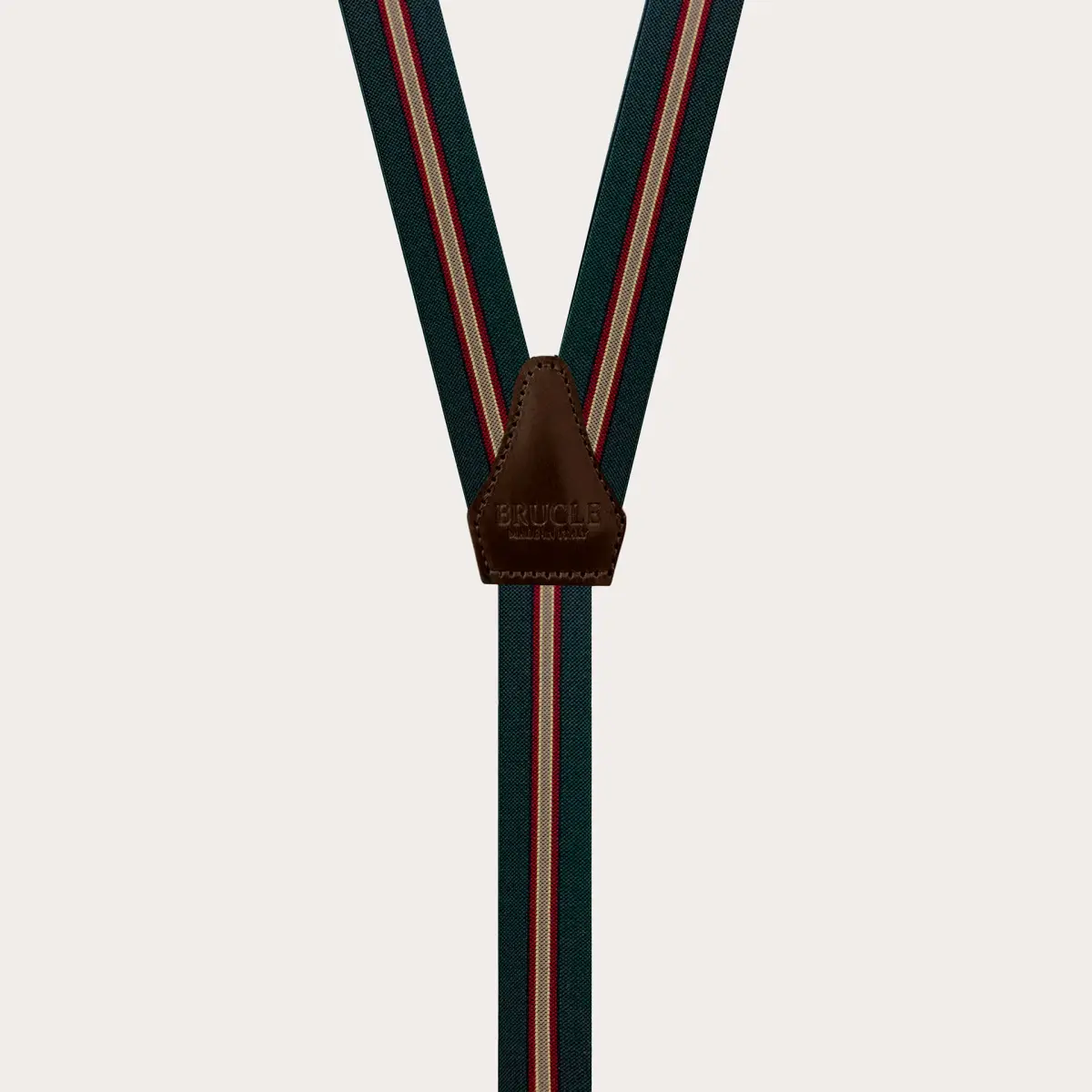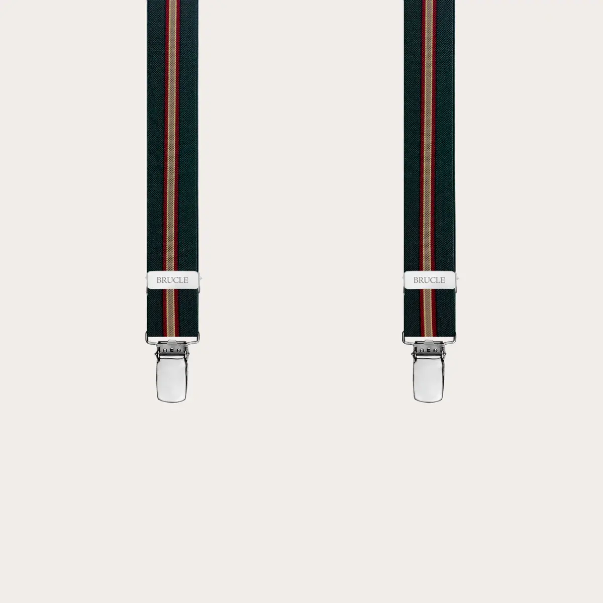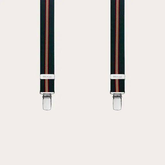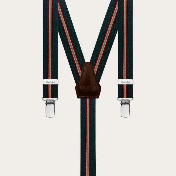 Bretelles vert régimentaire avec attache par clip en élastique étroit. Un motif original qui réinterprète le classique régimentaire. Polyvalent et facile à assortir, il est disponible en plusieurs couleurs. Un modèle de bretelles unisex, personnalisable avec des gravures sur les clips. Découvrez toute la collection de bretelles homme et femme de Brucle.