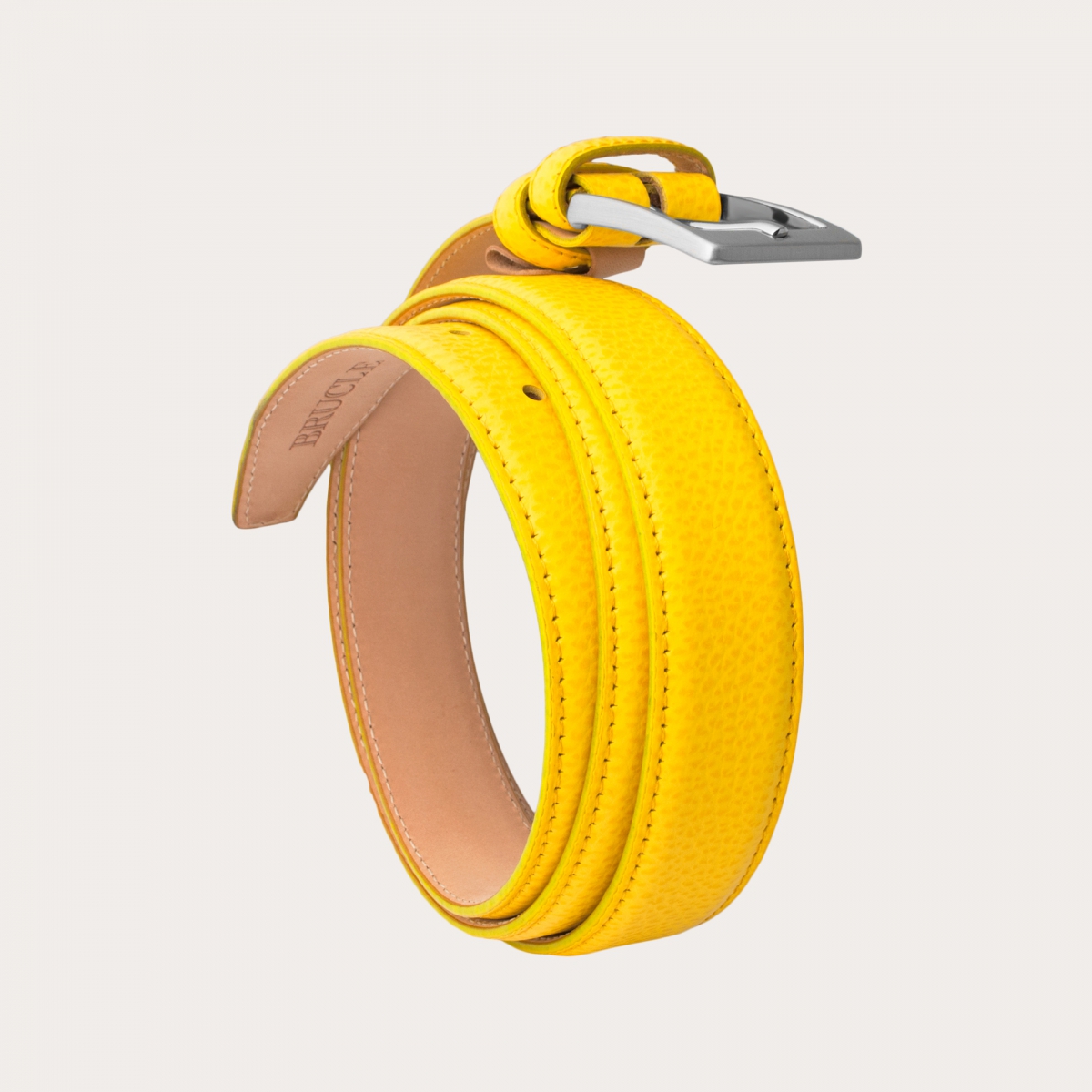 La ceinture en cuir jaune de Brucle est l'accessoire idéal pour apporter une touche de couleur à votre tenue. Fabriquée en Italie avec des matériaux de haute qualité, la ceinture est en véritable cuir et possède une couleur unique, ce qui la rend parfaite pour ceux qui veulent se démarquer avec style. La texture bottalato ajoute une touche d'originalité et de sportivité, parfaite pour toutes les occasions. La ceinture est facile à raccourcir grâce à la boucle amovible, vous permettant de personnaliser la longueur en fonction de vos besoins. De plus, la ceinture peut être personnalisée avec la gravure d'initiales, de dates ou de logos, en en faisant un accessoire unique et personnel. Le jaune est une couleur qui attire l'attention et surprend, parfaite pour ceux qui veulent se faire remarquer et se démarquer de la foule : cette ceinture jaune vous permettra d'exprimer votre personnalité et votre goût pour la mode de manière originale et sophistiquée.