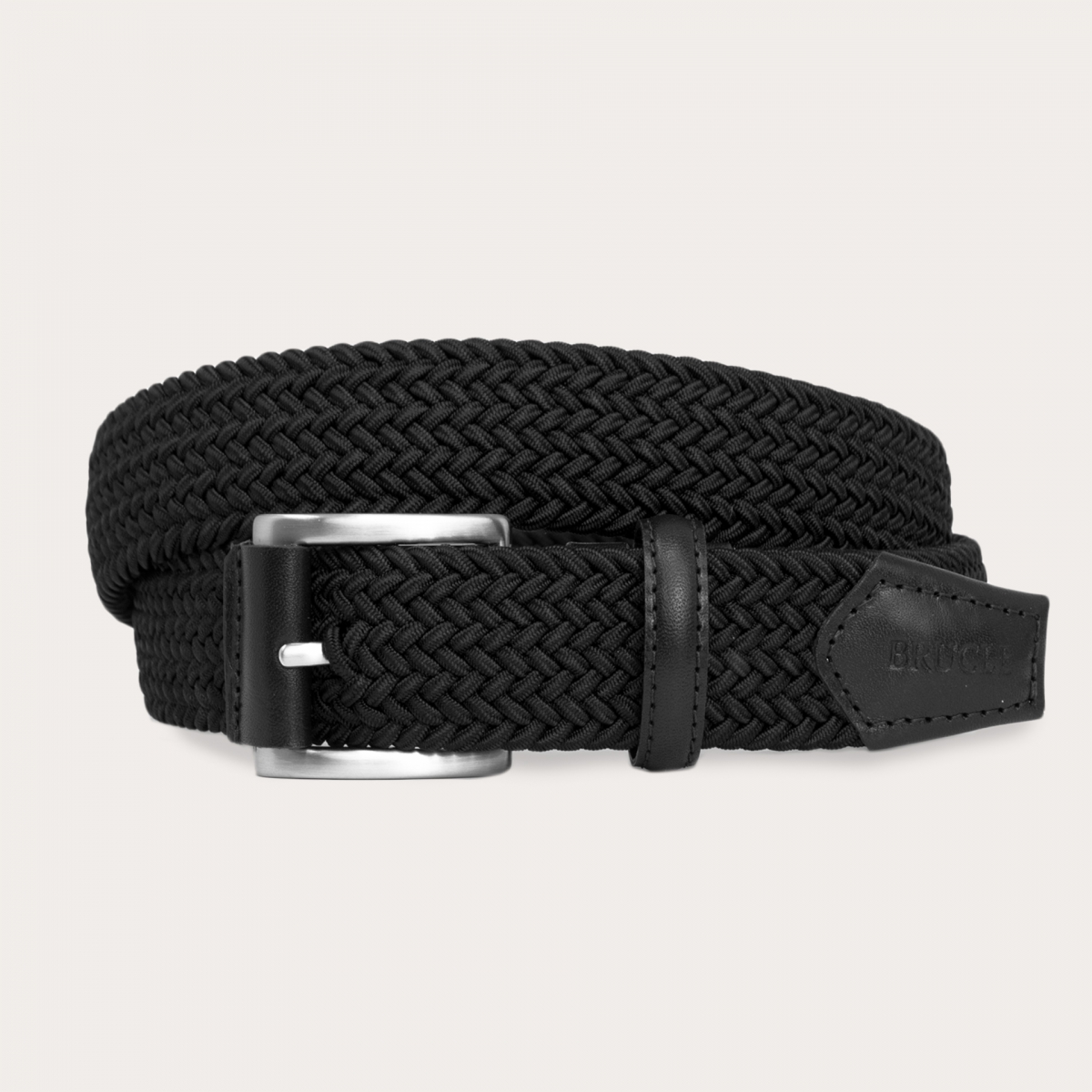 Ceinture élastique tressée noire agrémentée d'une boucle en laiton recouverte de cuir de vachette souple de la même couleur. A porter en toute saison.