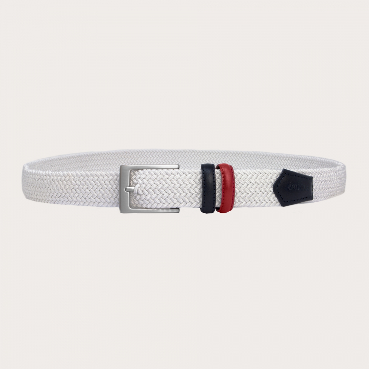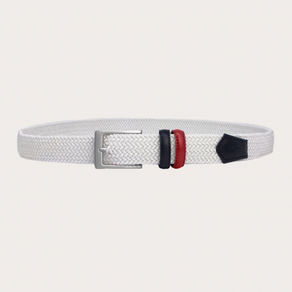 Ceinture tressée élastique blanc, agrémentée de passants en cuir colorés à la main pour créer un accessoire de mode haut de gamme unique. Un modèle exclusif de ceinture élastique décontractée, fabriquée avec des élastiques italiens et finie avec du cuir de bovin véritable teint à la main et une boucle entièrement en laiton sans nickel.