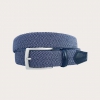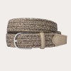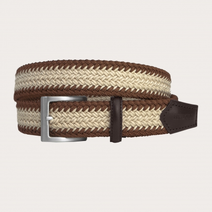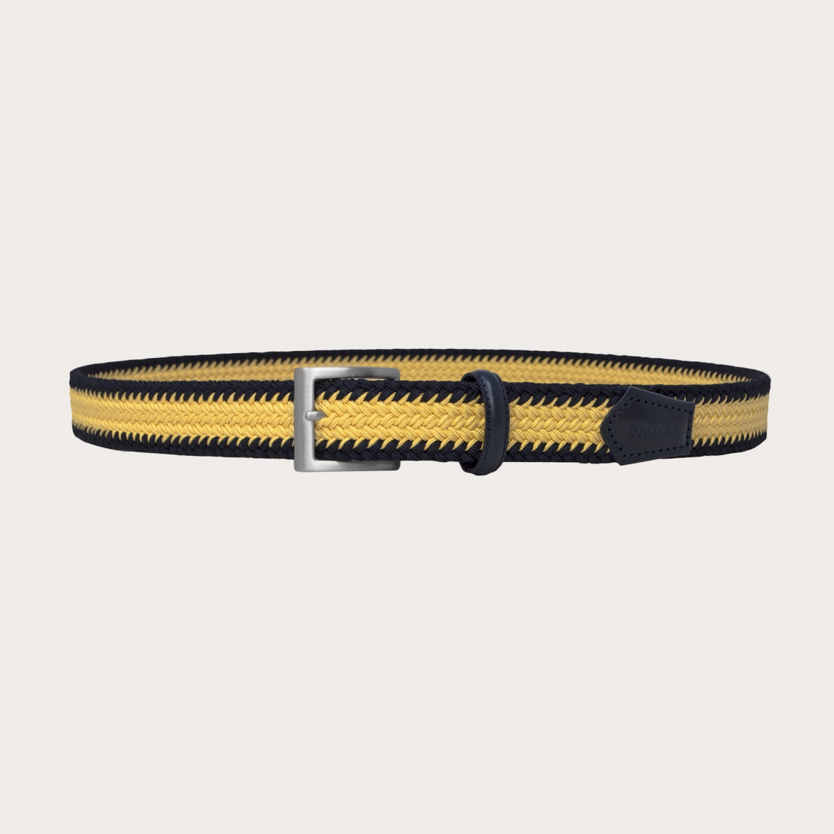 Ceinture tressée élastique dans un étonnant jaune moutarde chiné, rehaussée de détails en cuir coloris cognac teinté à la main et d’une boucle couleur ruthénium sans nickel.