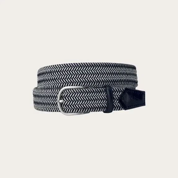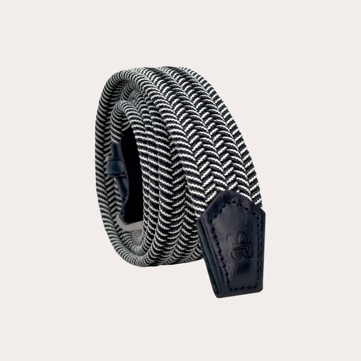 Originale ceinture élastique tressée bicolore blanc et bleu marine, avec boucle en laiton satiné sans nickel. Un modèle facile à assortir, entièrement fait à la main en Italie avec les meilleurs matériaux. Cette ceinture élastique est également personnalisable avec des gravures sur la boucle, pour un produit encore plus exclusif. Fournie dans une élégante boîte de marque et un sac pour ceinture en coton biologique, c'est une idée de cadeau unisexe qui sera certainement appréciée.