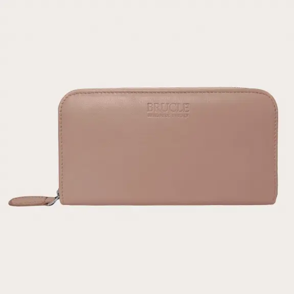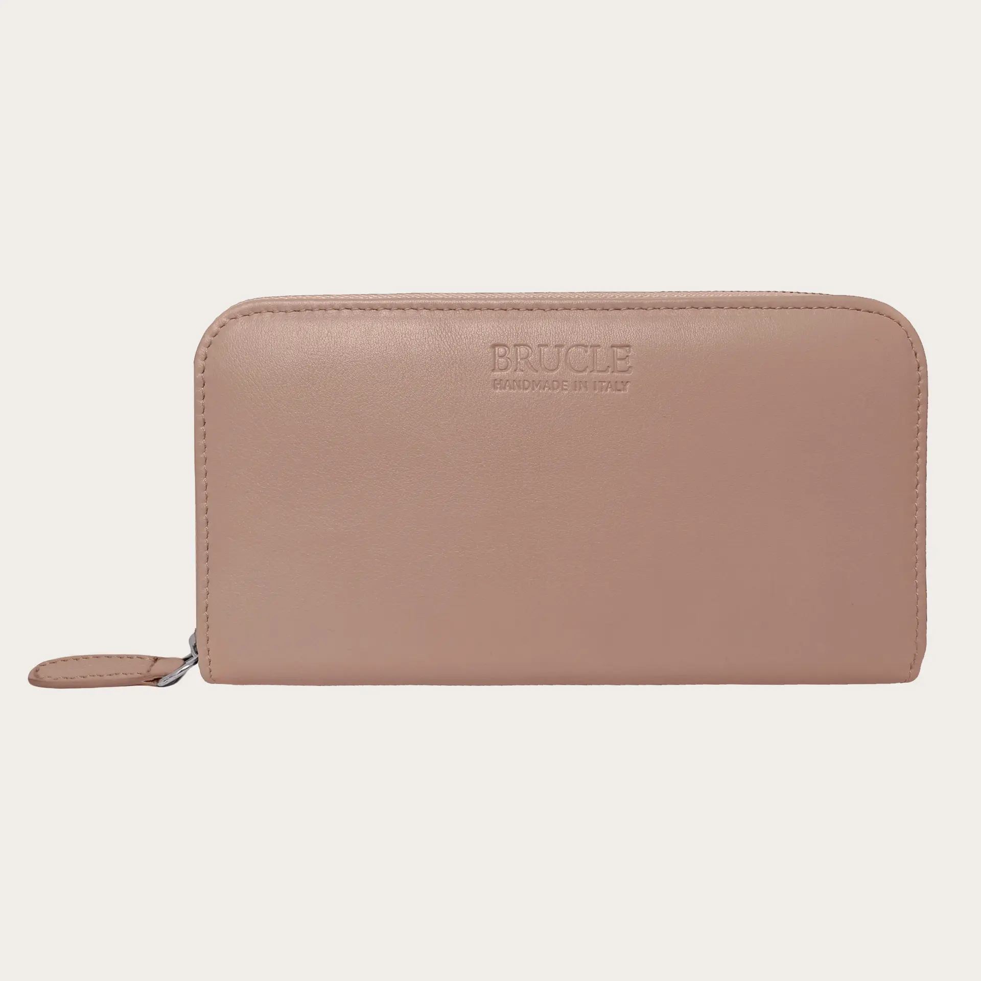 Portefeuille pour femme de couleur poudre en cuir véritable avec fermeture éclair, au design spacieux et essentiel. Fabriqué entièrement en Italie avec des matériaux de haute qualité, il garantit un style raffiné et un accessoire durable dont la beauté ne peut que s'améliorer avec le temps.